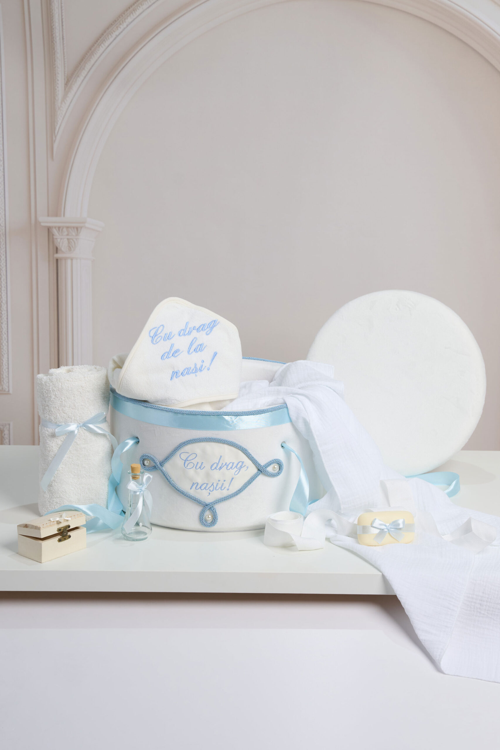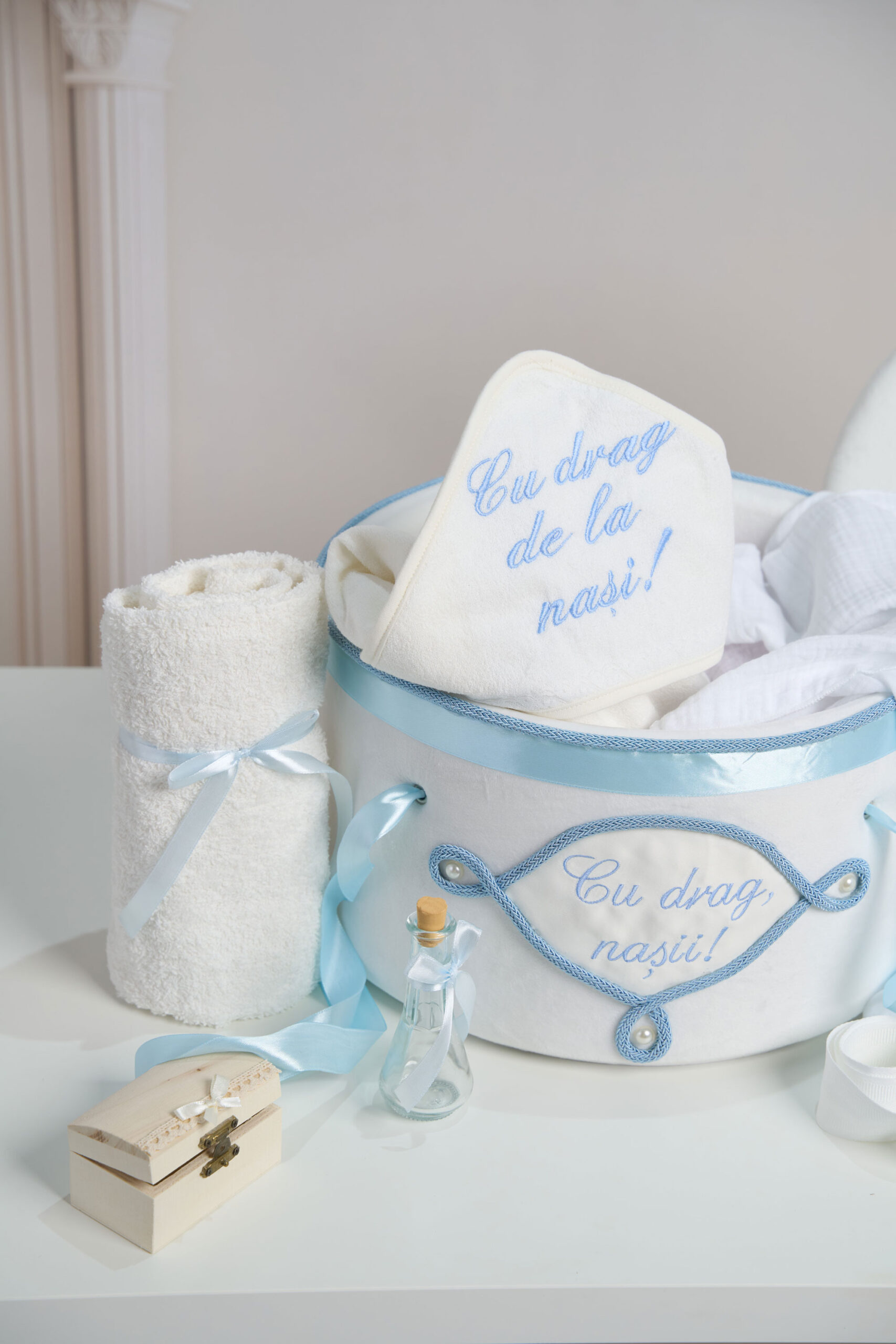 Conține: 🎀 Cufăr buretat din catifea pufoasă ivoire, buretat – brodat cu mesajul „Cu drag, nașii!” – panglici și detalii fine – ideal pentru transportul trusoului la biserică și pentru a păstra amintiri prețioase