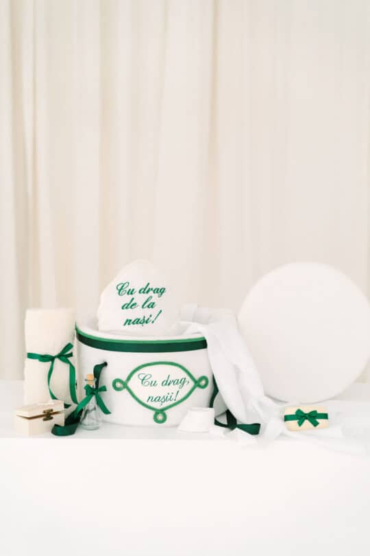 Conține: 🎀 Cufăr buretat din catifea pufoasă ivoire, buretat – brodat cu mesajul „Cu drag, nașii!” – panglici și detalii fine – ideal pentru transportul trusoului la biserică și pentru a păstra amintiri prețioase