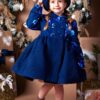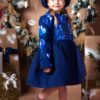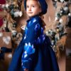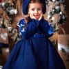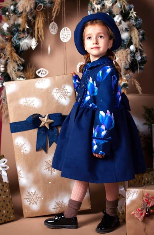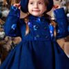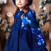 Bustul, gulerul și mânecile sunt evidențiate cu detalii bandă de catifea creață. La spate paltonașul are o fundă din stofă , detaliu care îi oferă paltonașului un aer jucăuș înveselindu-l.