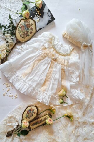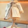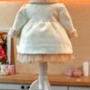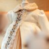 Materialele din care este confecționat paltonașul sunt: stofă, blăniță artificială, bandă decor trandafiri, bandă dantelă.