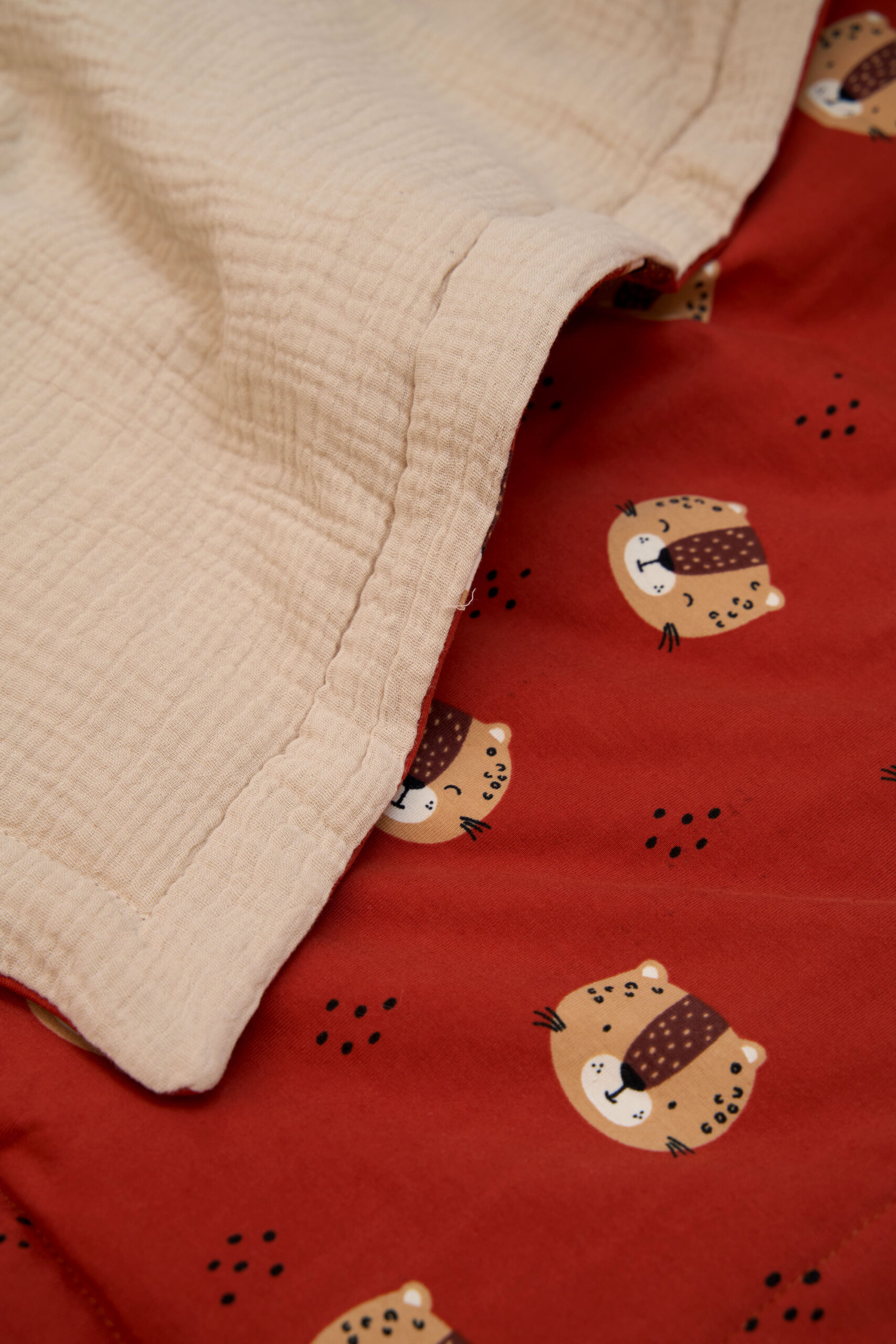 Această combinație de culori și ilustrații jucăușe transformă păturica într-un accesoriu perfect pentru somn, plimbări sau momente de relaxare ale bebelușului tău, aducând o notă de aventură în fiecare zi.