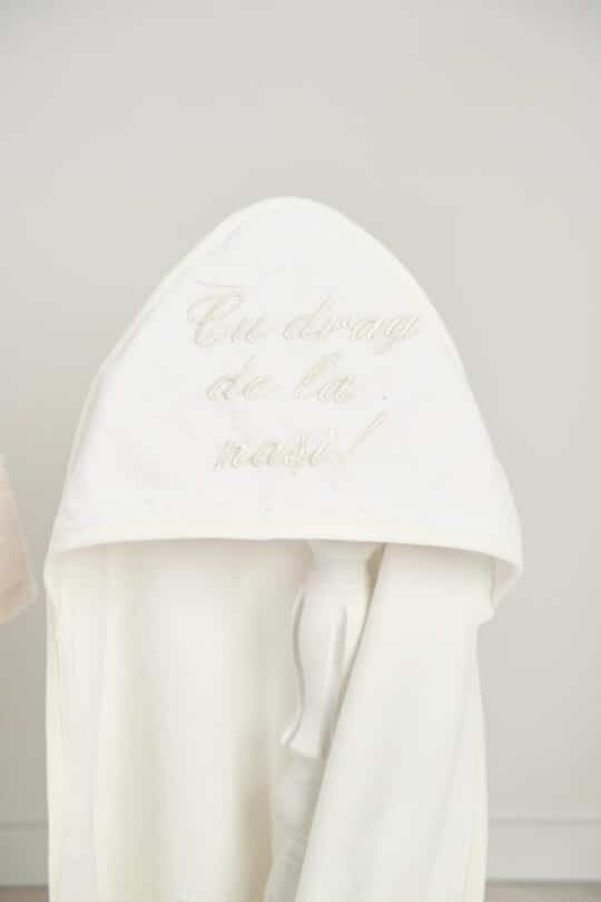 Capișonul poate fi personalizat cu numele copilului și data evenimentului, transformând prosopul într-o amintire de neuitat.