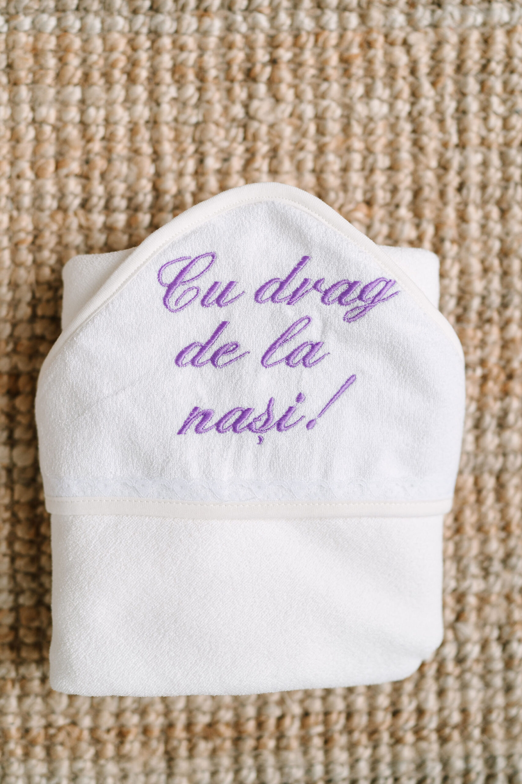 Capișonul poate fi personalizat cu numele copilului și data evenimentului, transformând prosopul într-o amintire de neuitat.
