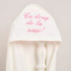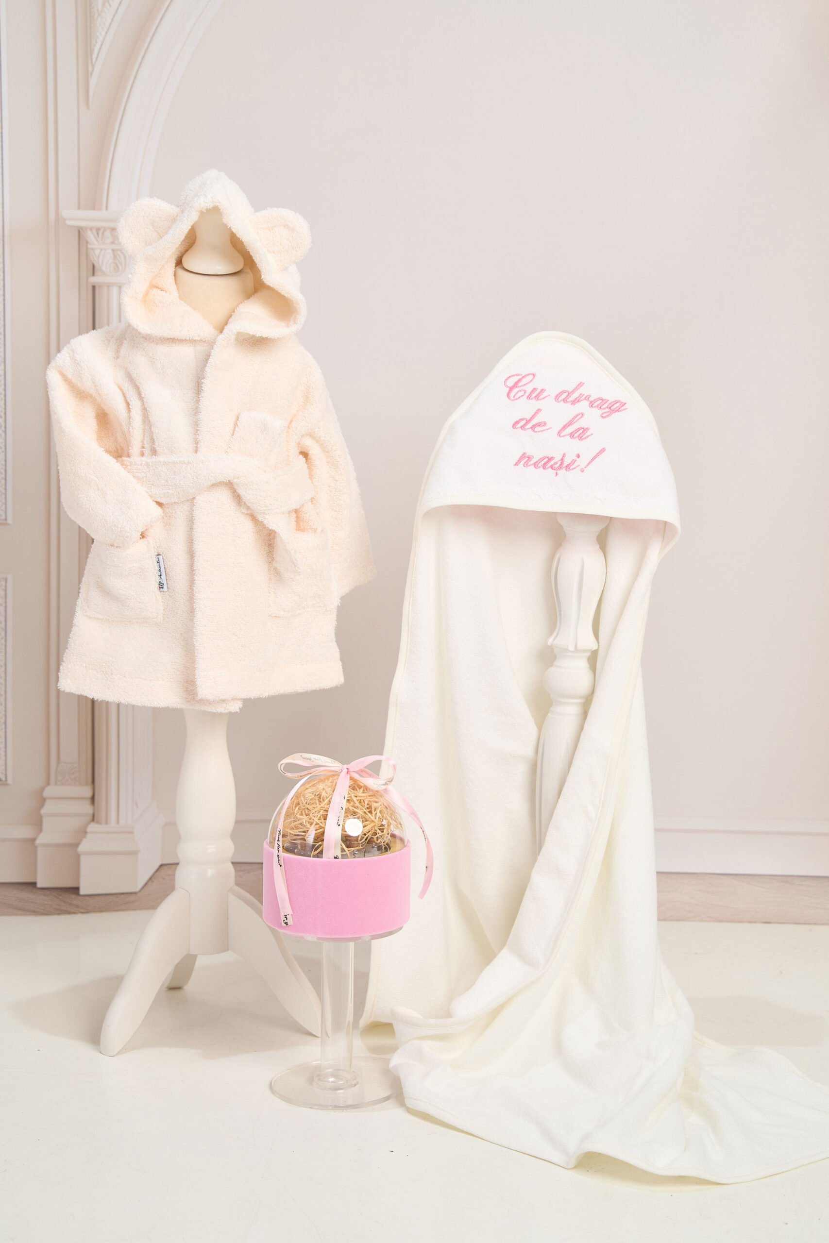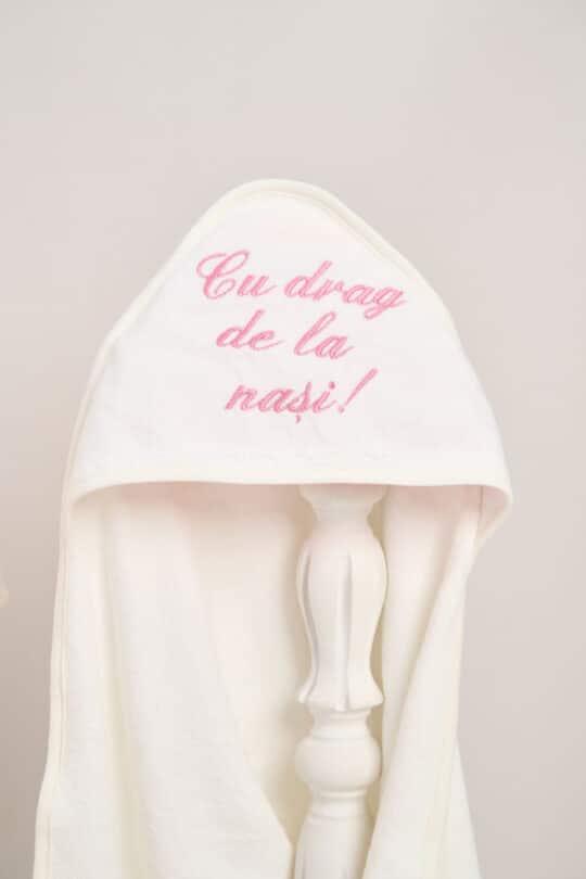 Capișonul poate fi personalizat cu numele copilului și data evenimentului, transformând prosopul într-o amintire de neuitat.
