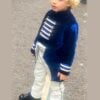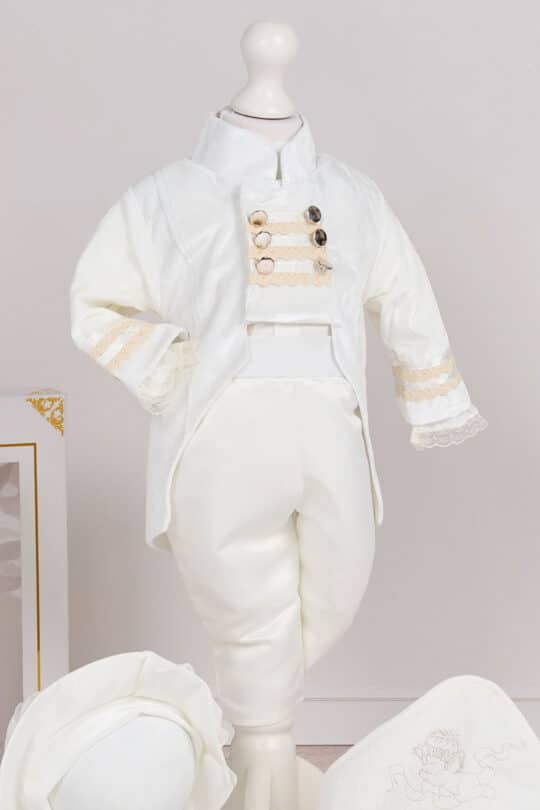 Redingota pentru bebeluși este prin excelență dedicată ceremoniilor. Redingota este din catifea, tip tunică, cambrată, evazată, închisă până sub gât și cu șliț la spate. Pe piept se găsesc detalii de dantelă, bandă satin și nasturi aurii. Cămașa este din poplin, alb-ivoire cu mâneci crețe și dantelă, manșetele cămășii se ivesc de sub mânecile catifelate ale redingotei.