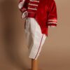 Pantalonii sunt din tafta, au vipușcă lateral asortată cromatic și talie înaltă care se termină într-un brâu din catifea. Șepcuța este din catifea și tafta. Sacoul și pălăriuța sunt căptușite lejer, cu căptușeală golf pentru ținuta costumului, celelalte piese ale costumului sunt necăptușite.
