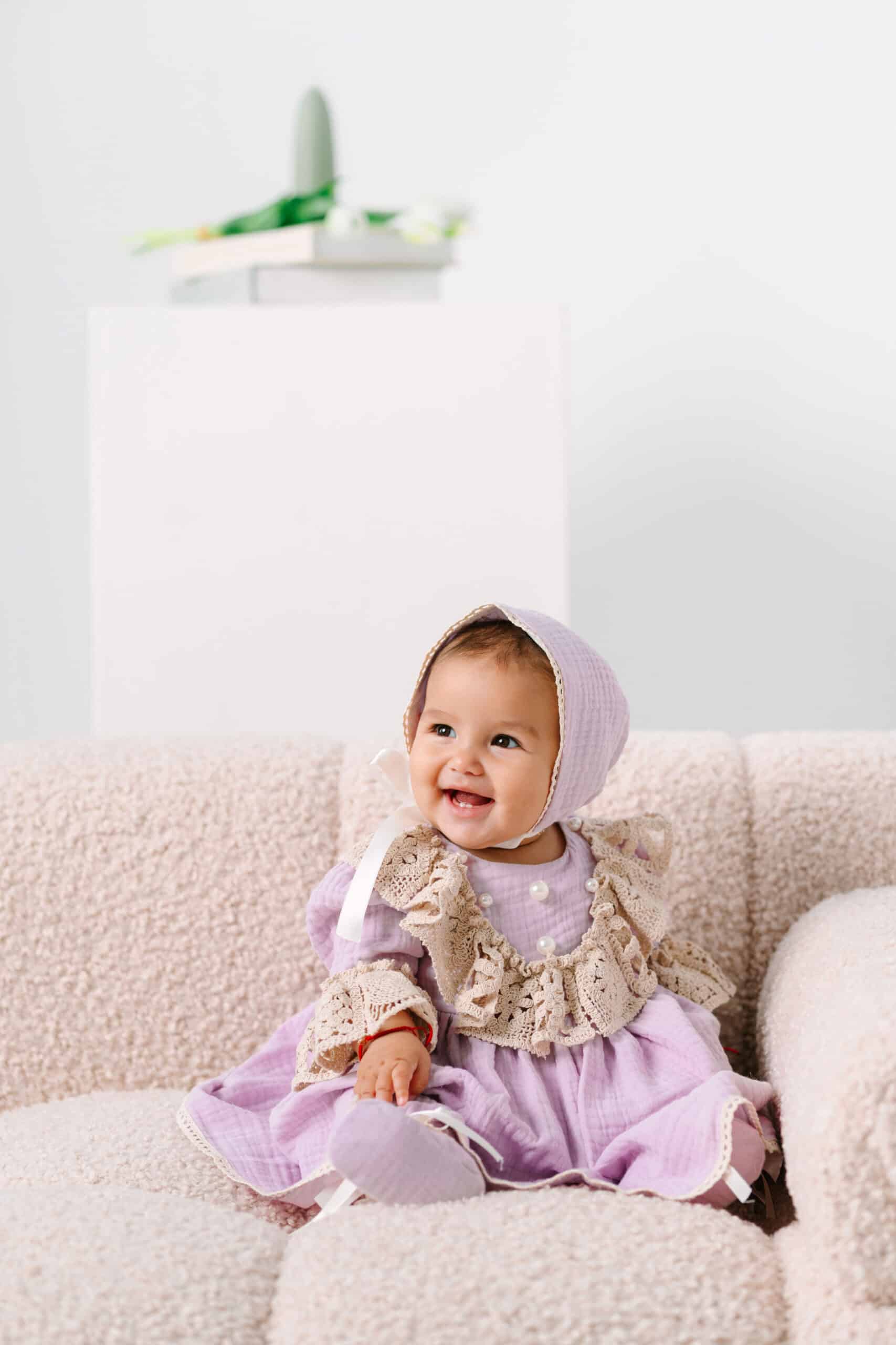 Rochița este confecționată din muselină triplustrat, mai groasă și mai bogată decât muselina obișnuită, oferind o ținută bine structurată, confortabilă și potrivită pentru un eveniment important precum botezul. Detaliile ample din dantelă croșetată manual, inspirate din motive create cu mîinile bunicilor noastre, împreună cu perlutele aplicate, îi conferă rochiței o notă aparte, elegantă și pură.