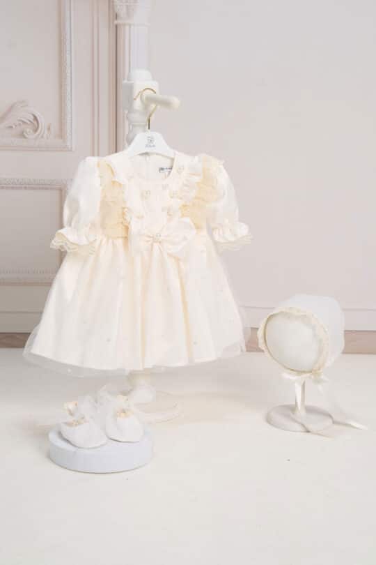 Compleul conține 3 piese: rochiță, bonetă, botoșei.