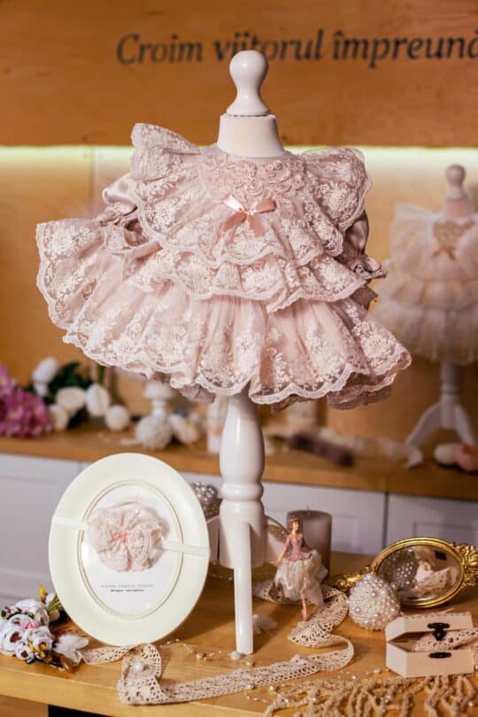 Această rochiță cu volane din dantelă este alegerea perfectă pentru un început de poveste de basm.