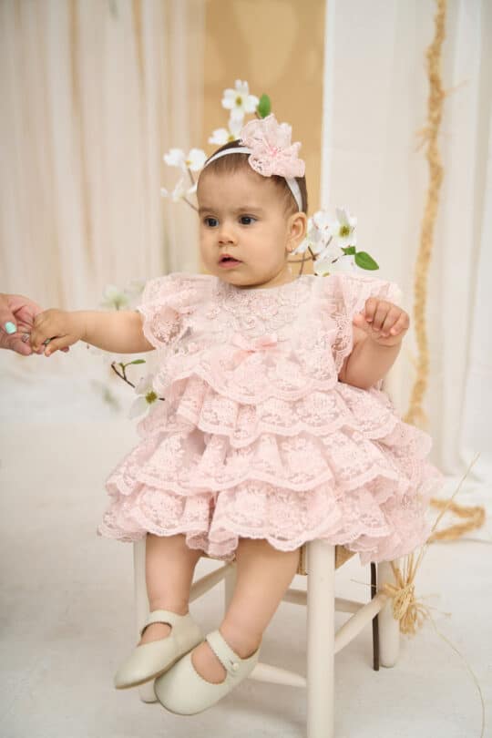 Această rochiță cu volane din dantelă este alegerea perfectă pentru un început de poveste de basm.