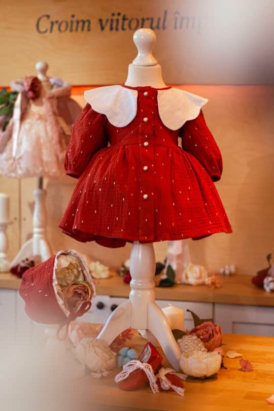 - Măsurile mari ( 3/4/5 ani) sunt completate de o clamă cu fundiță din același material ca rochița.