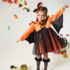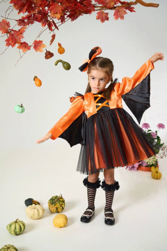 -Rochie cu aripi: Rochia este detaliată cu un corset decorativ, având șireturi portocalii în față. Atunci când fetița își deschide mâinile, ies la iveală aripile negre de liliac, cusute ingenios sub mâneci, oferindu-i un efect dramatic. Fusta din tulle în nuanțe de portocaliu și negru adaugă volum și fluiditate, conferind o notă dinamică întregului costum.