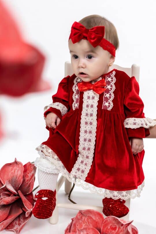 Pentru a completa lookul romantic rochiței i-am asortat o bonetă cu fundă de catifea.