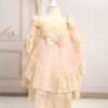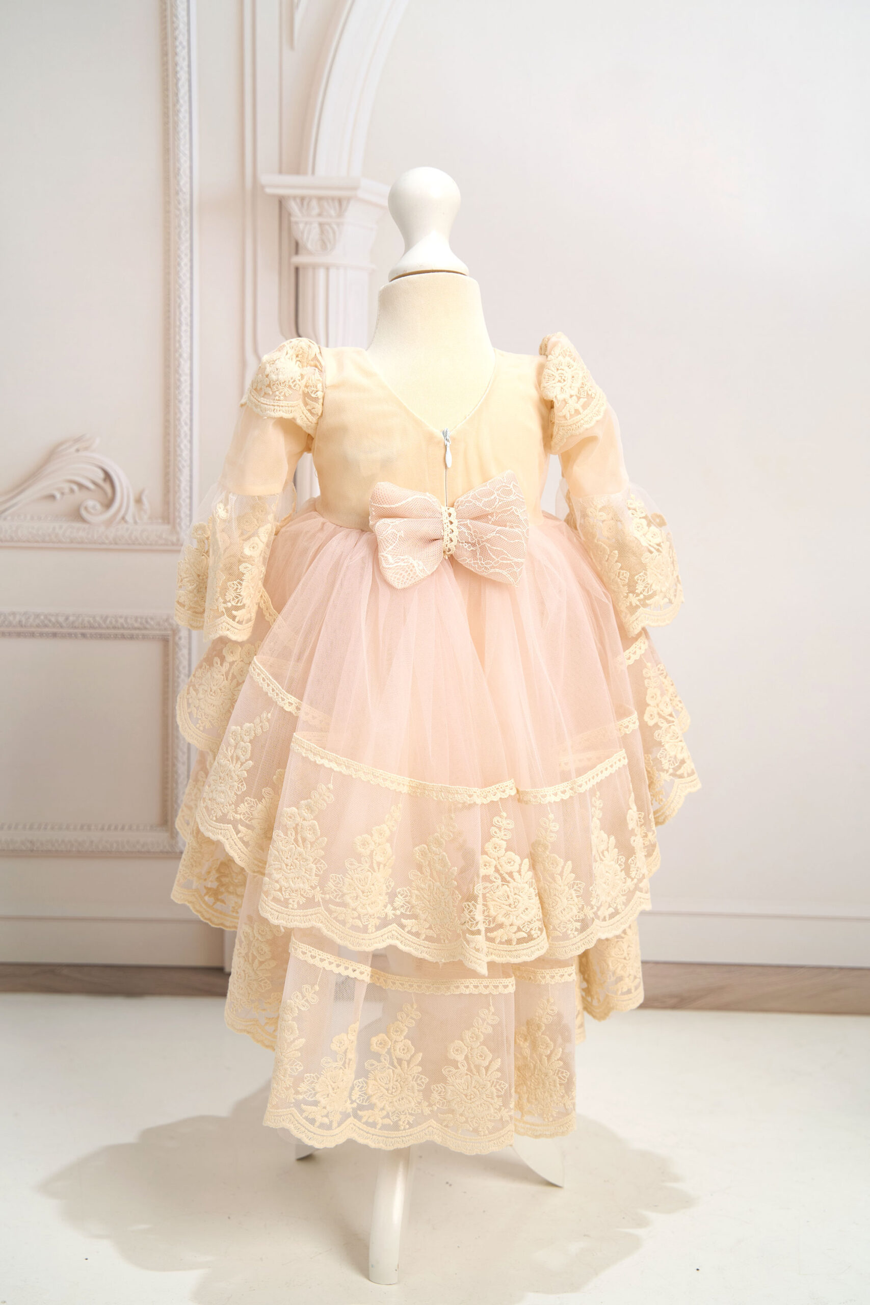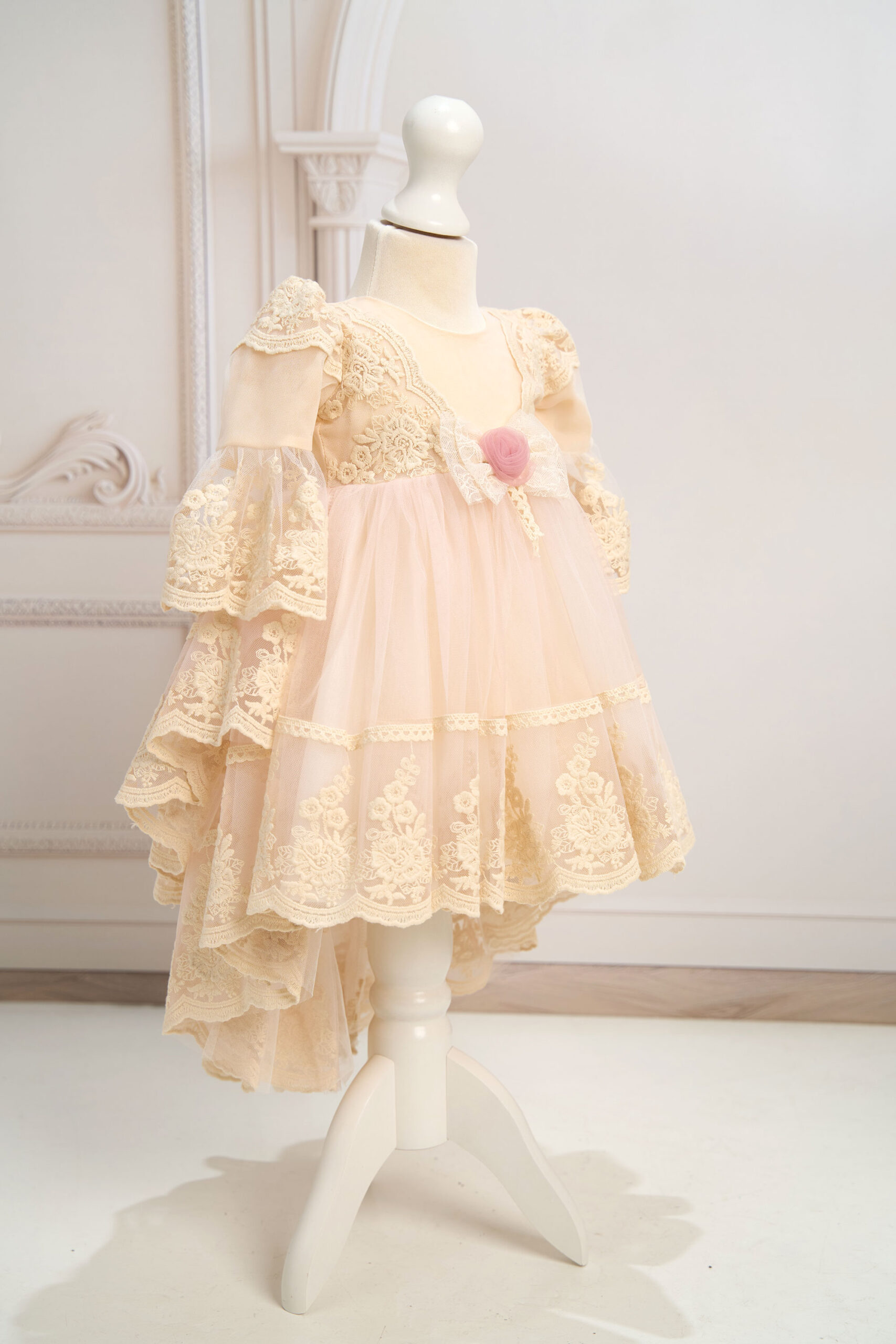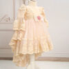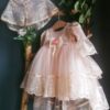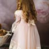 Rochiță în straturi subtile, din diferite nuanțe coloristice de tulluri transparente care dau un aer pictat întregului ansamblu de poveste. Croiul gulerașului și al spatelui este creat în tușe delicate și oferă gingășie rochiei.