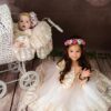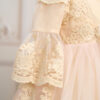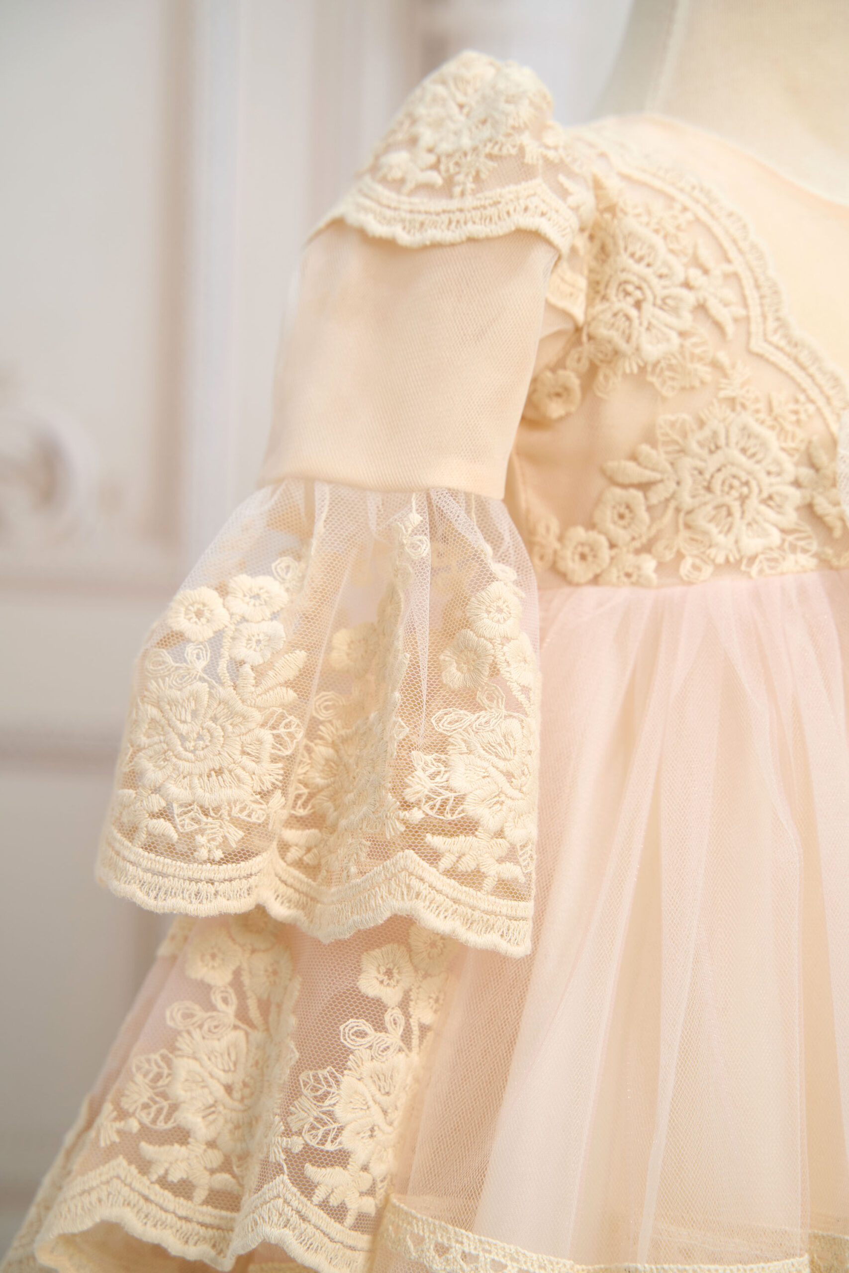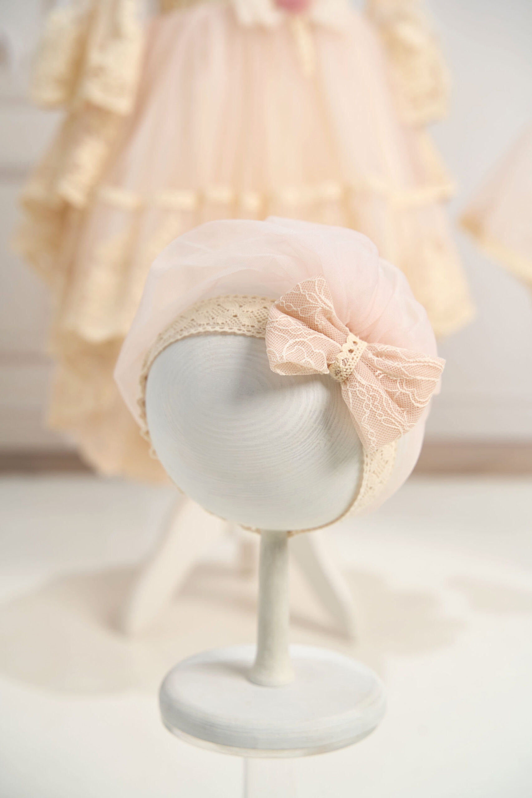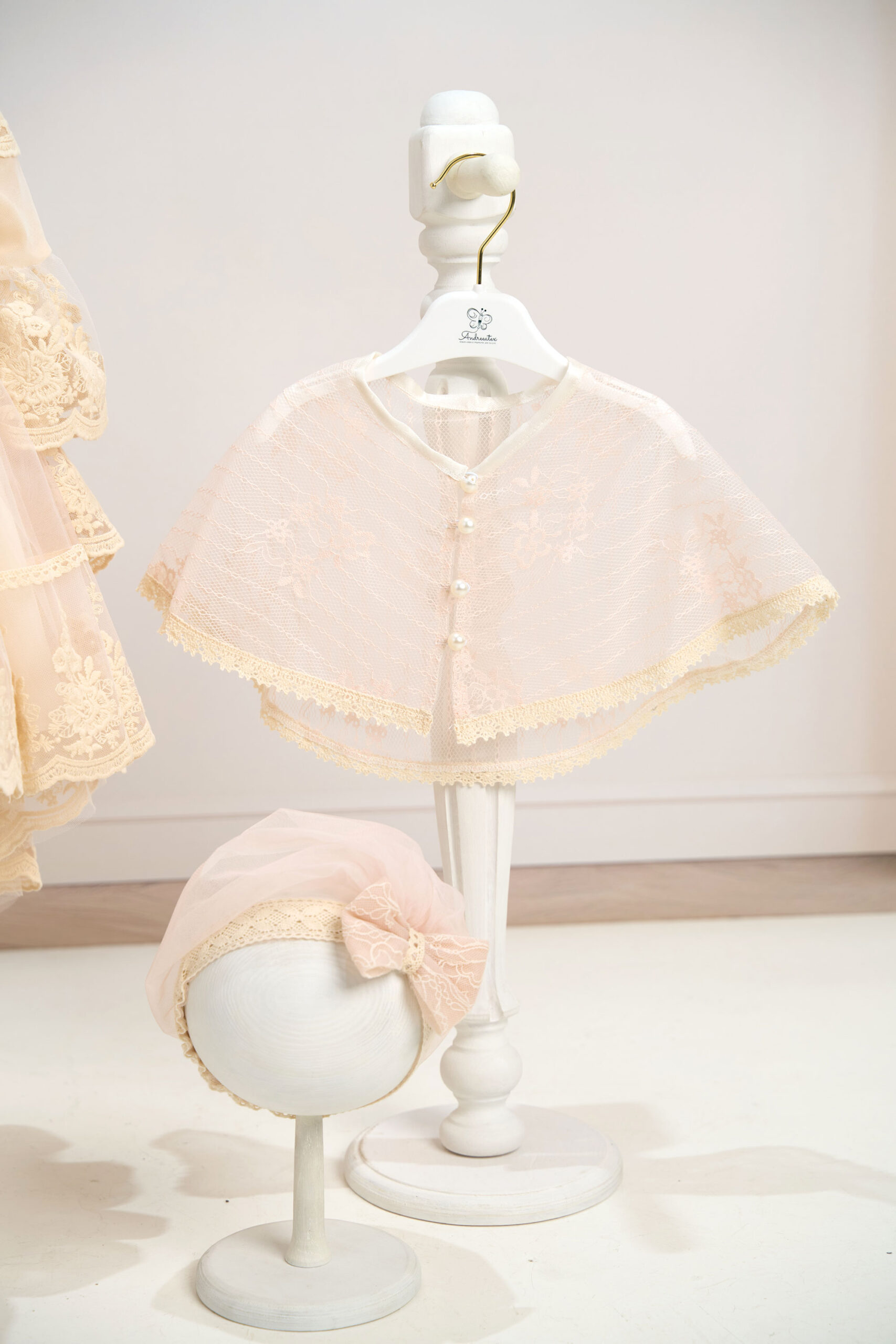 Rochița Lilibet este confecționată din voal, tull fin, dantelă florală, capa din dantelă tip chantilly, iar turbanul din tull transparent.