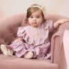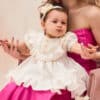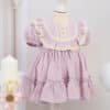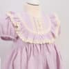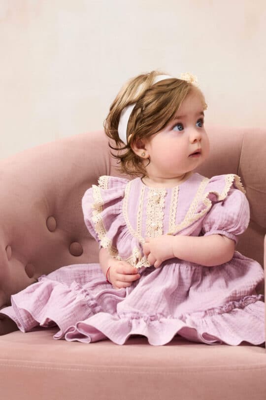 Rochiță din muselină moale cu volane și danteluțe pe bumbac. Pe parte de platcă are 3 nasturi perluțe decorativi.