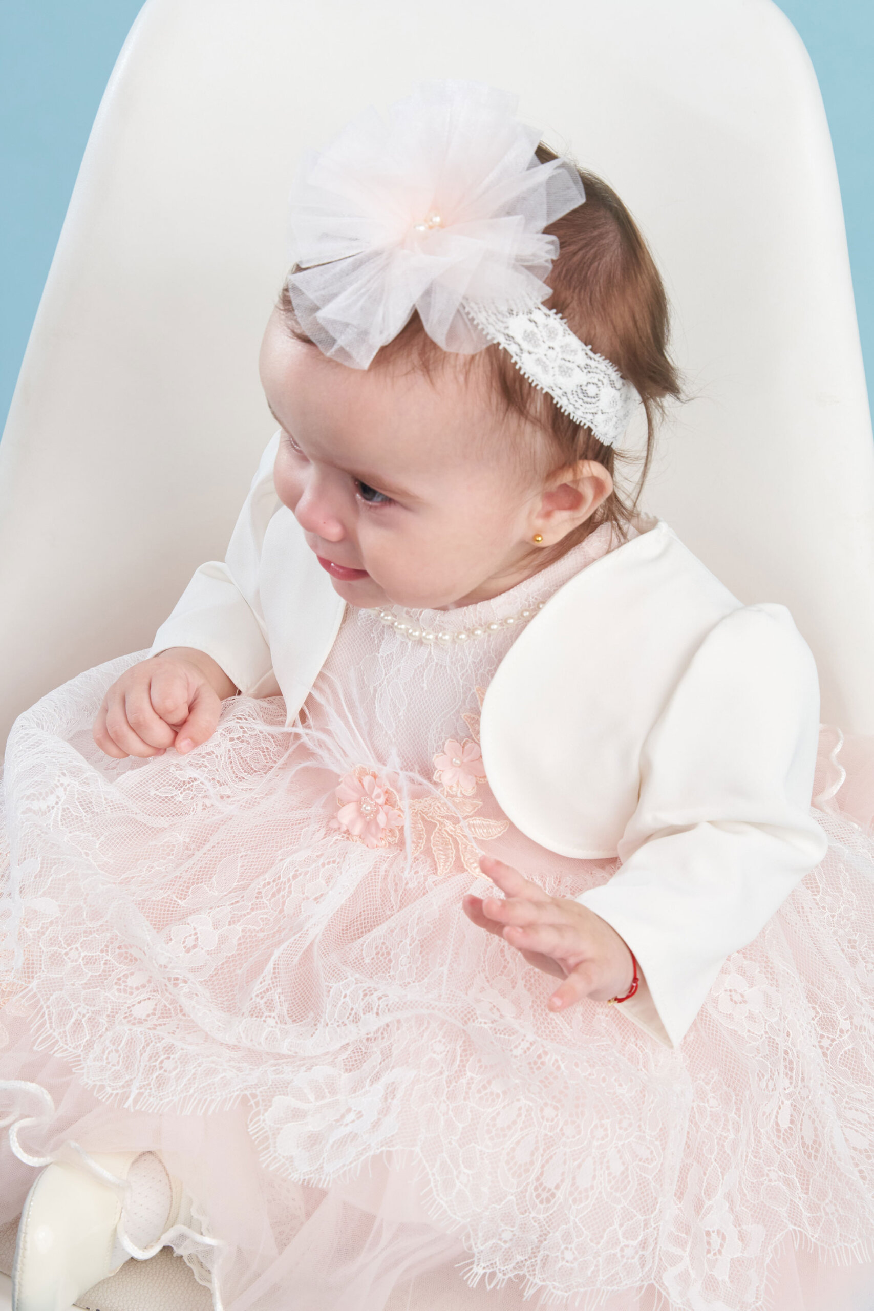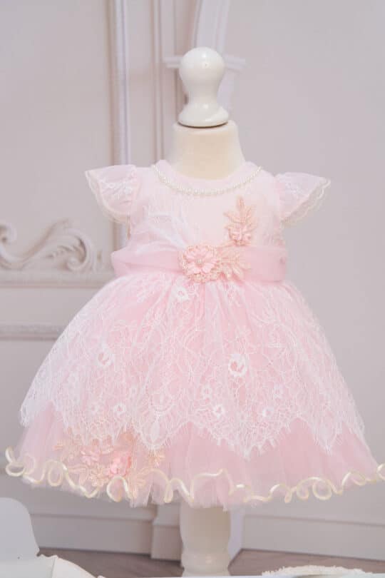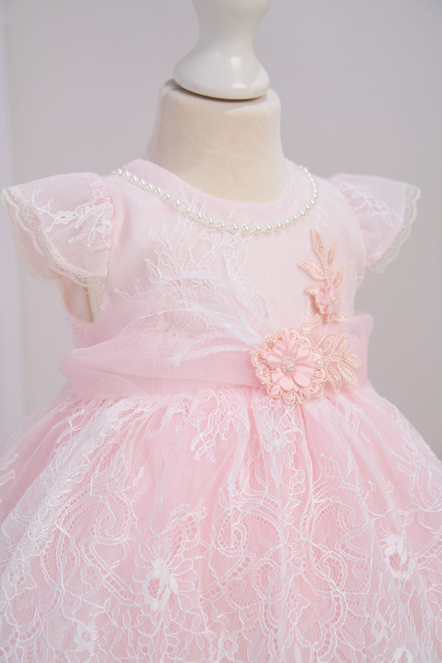 Rochiță manufacturată din dantelă Chantilly, fină, în culoare pastel.