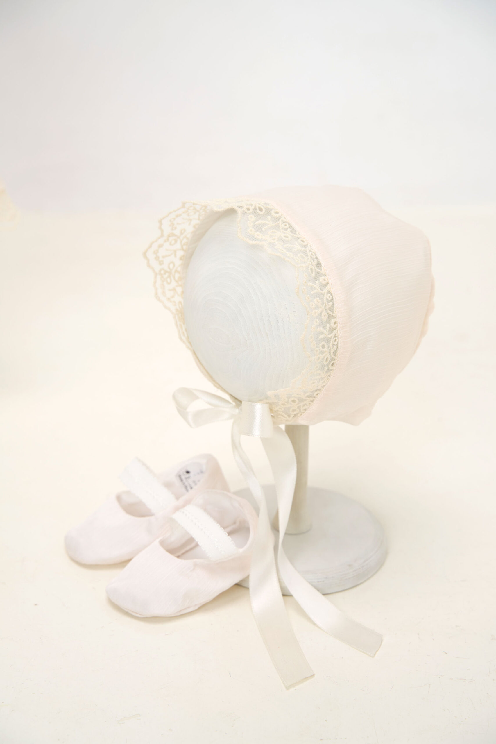 Compleul conține 3 piese: rochiță, bonetă, botoșei.