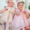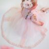 Rochița este accesorizată cu o bentiță cu tull încrețit formând o floare cu accente de broderie.