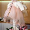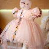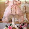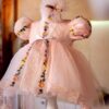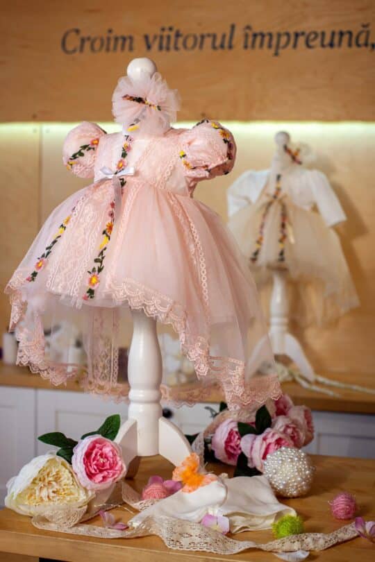 Rochița de botez cu trenă și flori brodate pe tull moale. Floricelele brodate prind viață, creând o atmosferă creativă în jurul micuței tale.