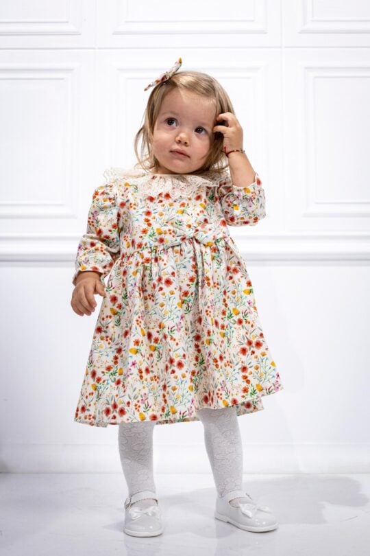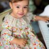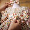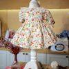 Rochiță creață în talie, manufacturată din raiat brodat cu floricele. Rochița are central o fundiță, are mânecile crețe, iar răscroiala gâtului este accentuată printr-un volan decor, din dantelă. Rochița are închidere în spate cu nasturi.