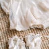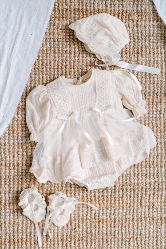 Salopetă bebe Tip Rochiță din Muselină în 3 Straturi cu Tull și Dantelă – 3 piese – ivoire