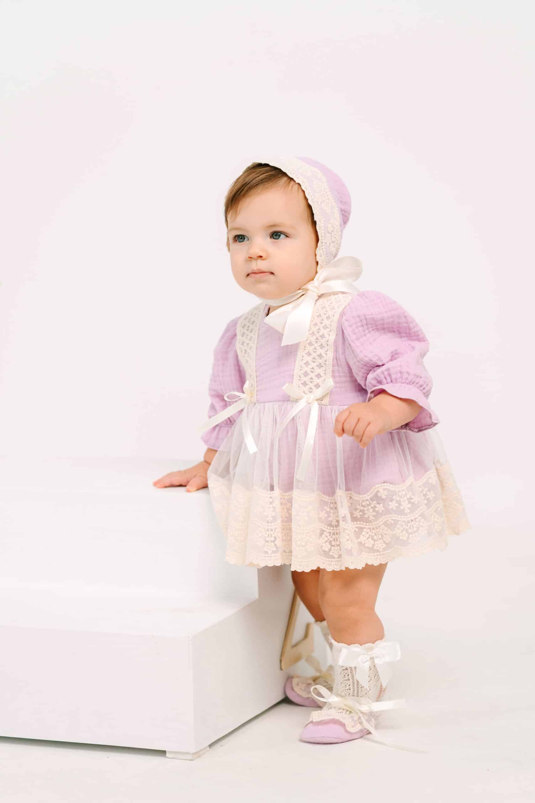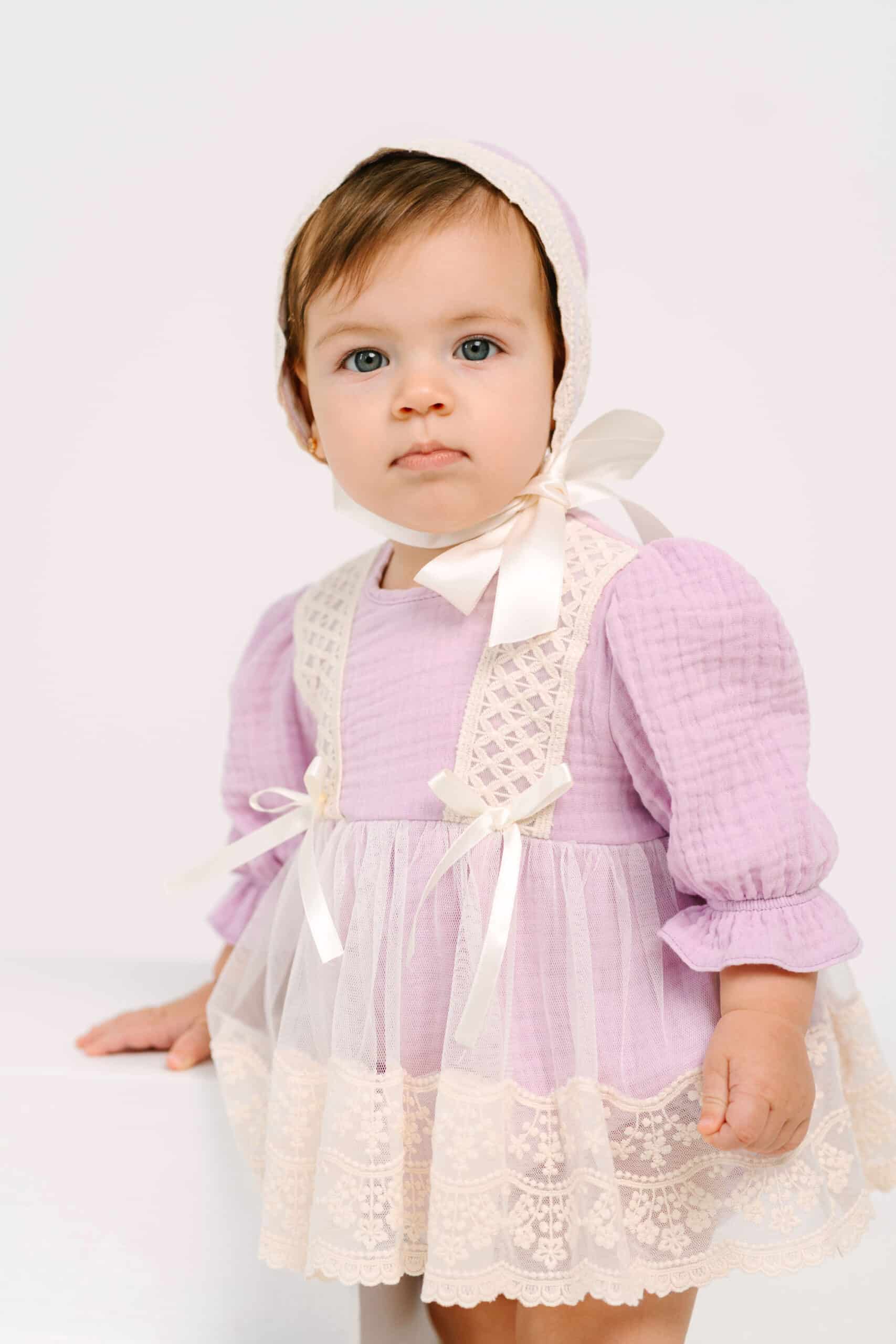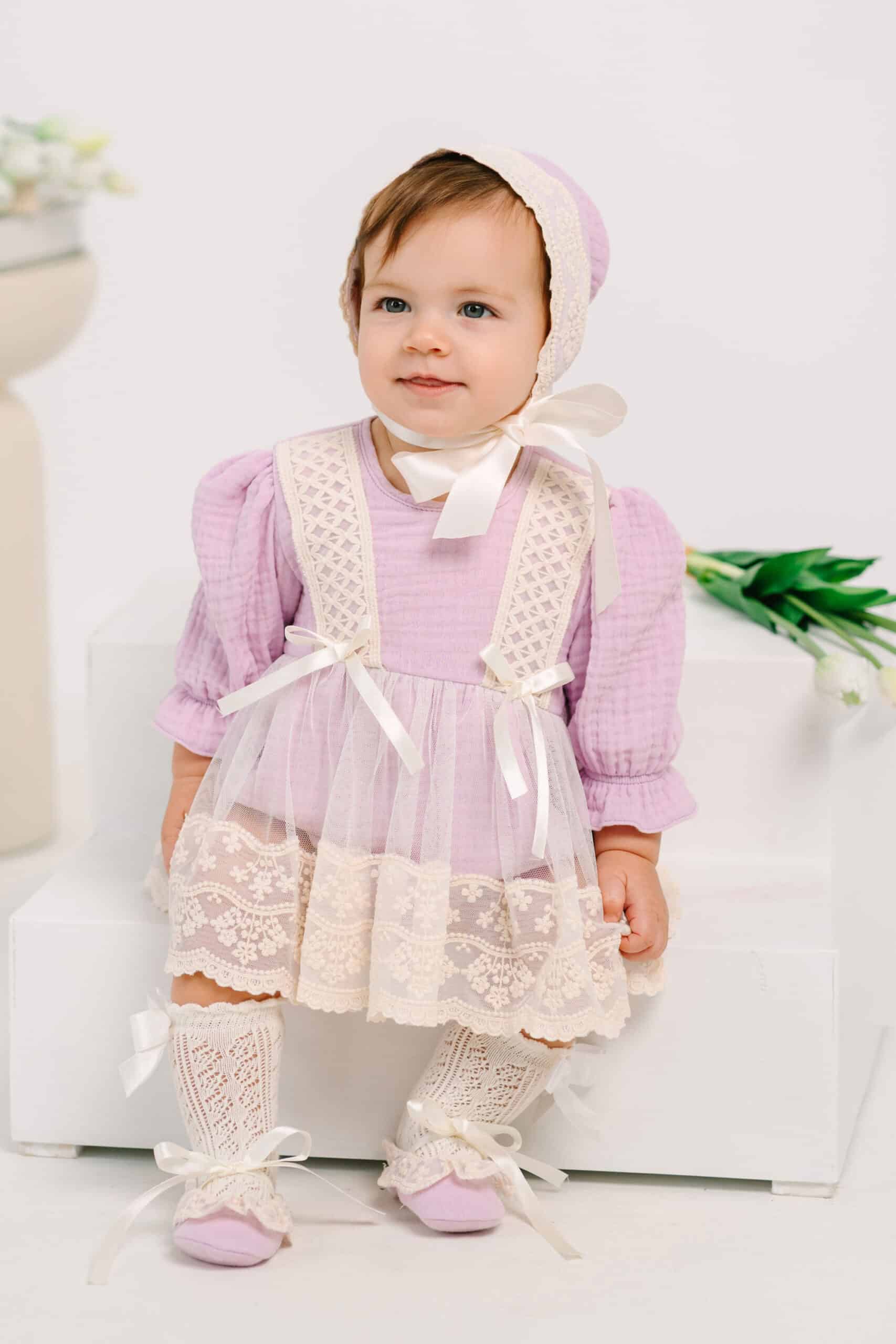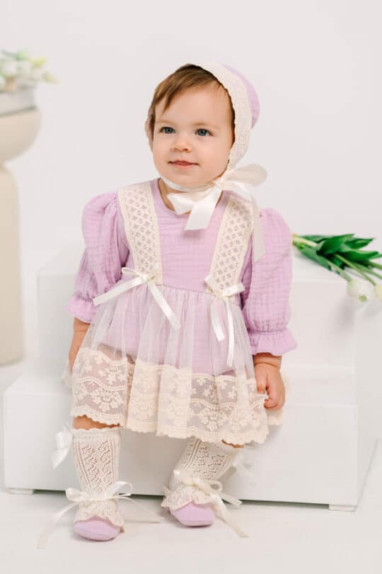 Salopetă bebe Tip Rochiță din Muselină în 3 Straturi cu Tull și Dantelă – 3 piese – lila