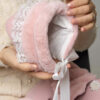 Setul are o bonetă asortată, din aceeași stofă, asortată cu blană roz, cu margini din dantelă albă. Boneta se leagă cu o panglică asigurând un plus de confort împotriva frigului, menținând stilul de poveste al setului.