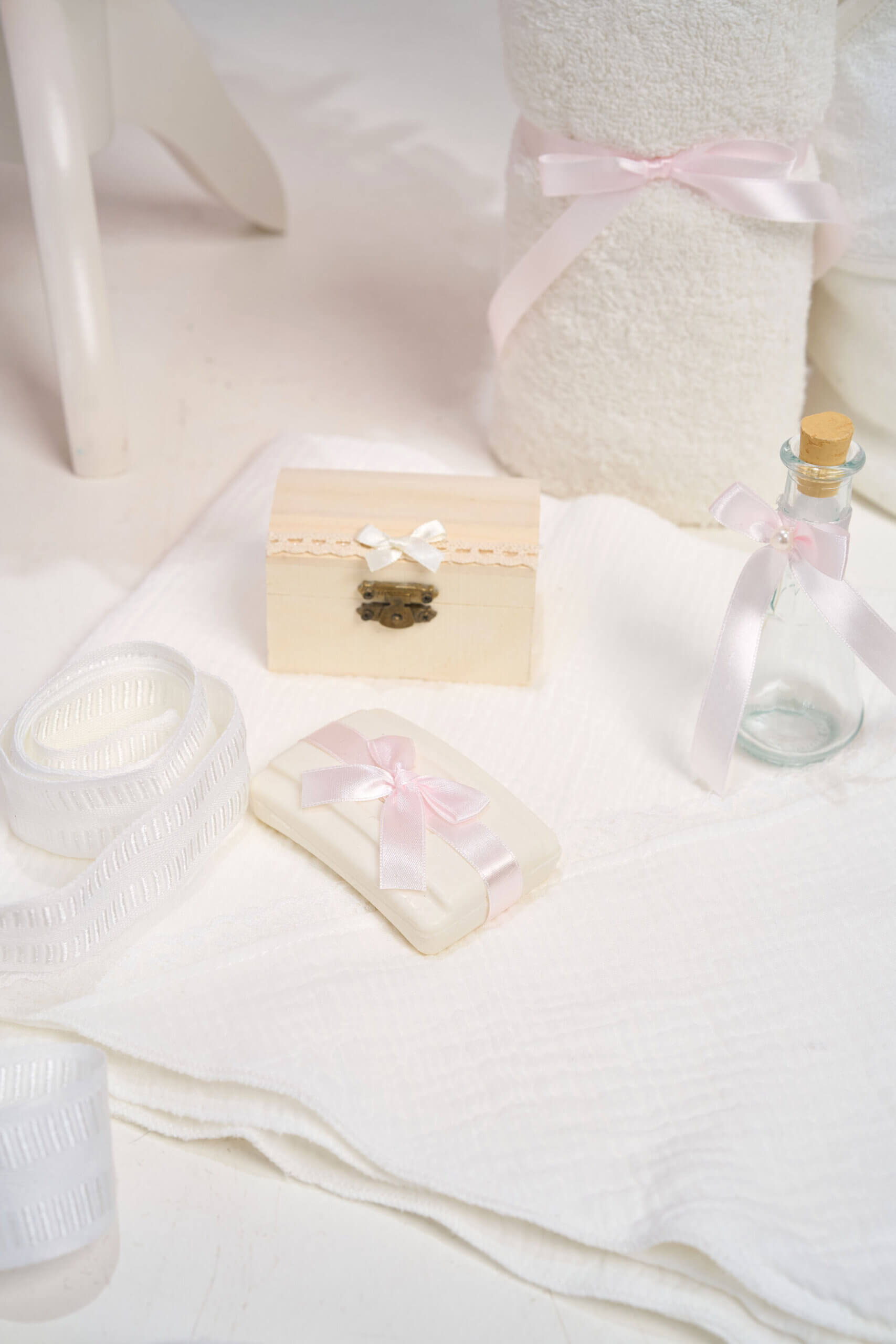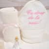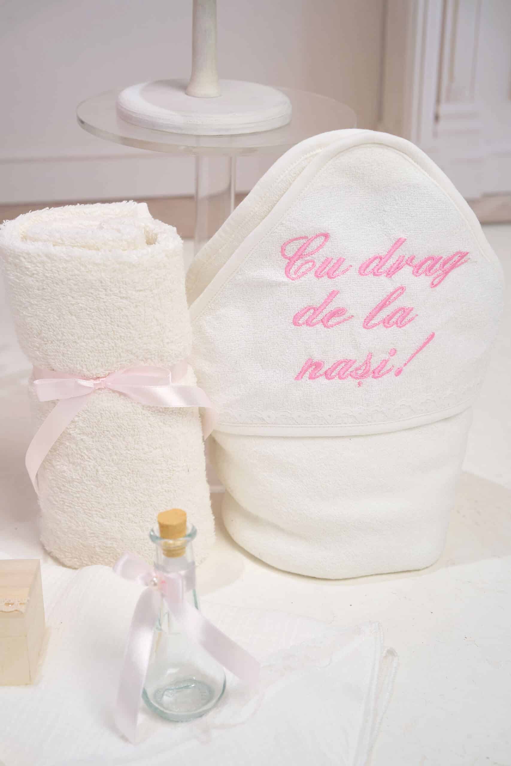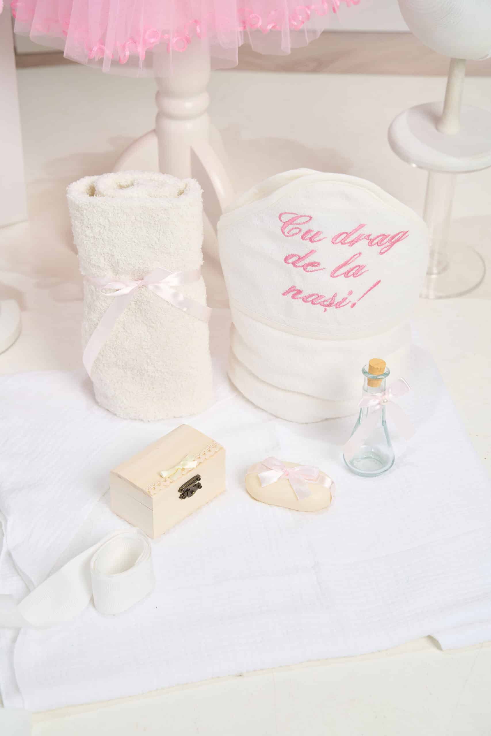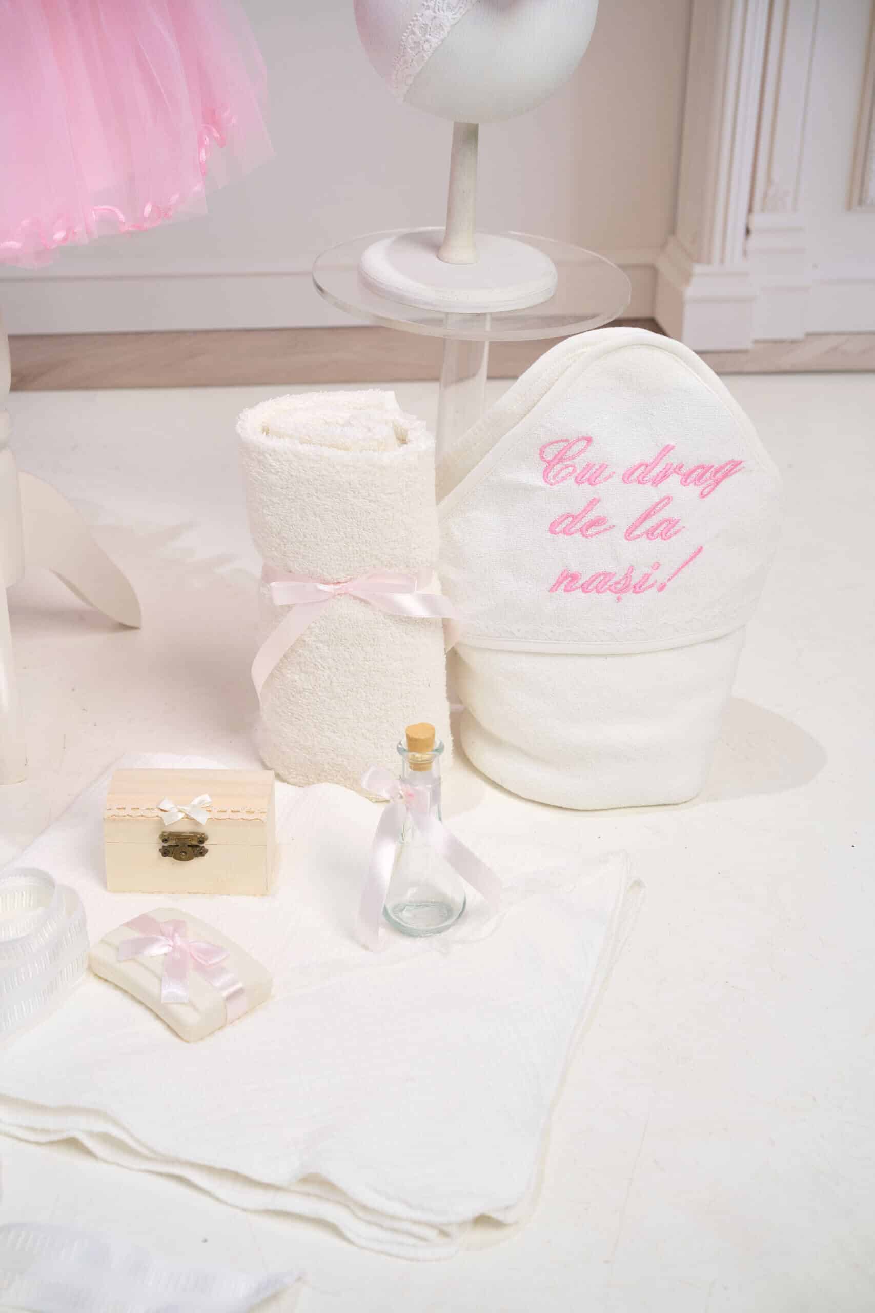 🕊️ Trusou de botez 7 piese – Tot ce ai nevoie într-un singur loc! Prosop cu capișon bebeluș, prosop preot, pânză cu capișon de mir, fașă, săpun, sticluță mir decorată și cutiuță pentru prima șuviță.