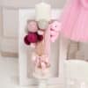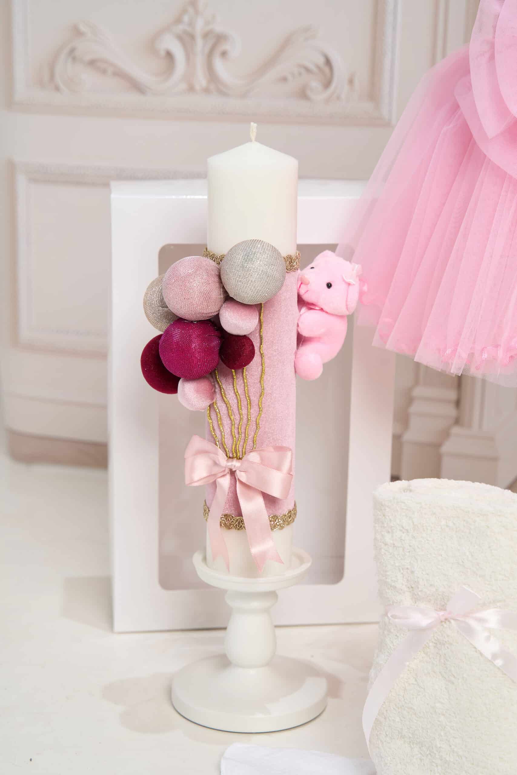 🕯️ Lumânare de botez –Lumânarea de botez este decorată elegant cu catifea roz pudrat, baloane textile sclipitoare în nuanțe de roz și argintiu, fundă satinată și un ursuleț adorabil, completând perfect o tematică delicată și rafinată pentru fetițe.