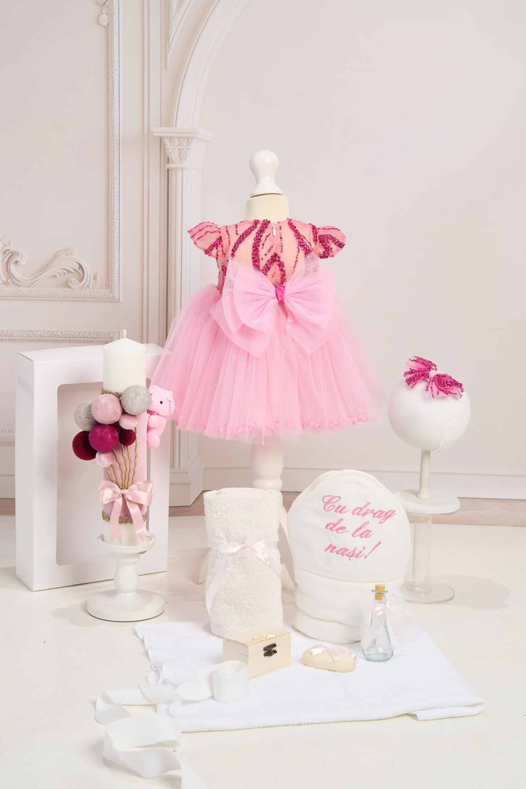 🎀 Set 2 piese –Arabella este o creație rafinată din tulle roz, cu bust brodat cu paiete strălucitoare și o fundă spectaculoasă la spate, ideală pentru o apariție de poveste în ziua cea mare.