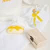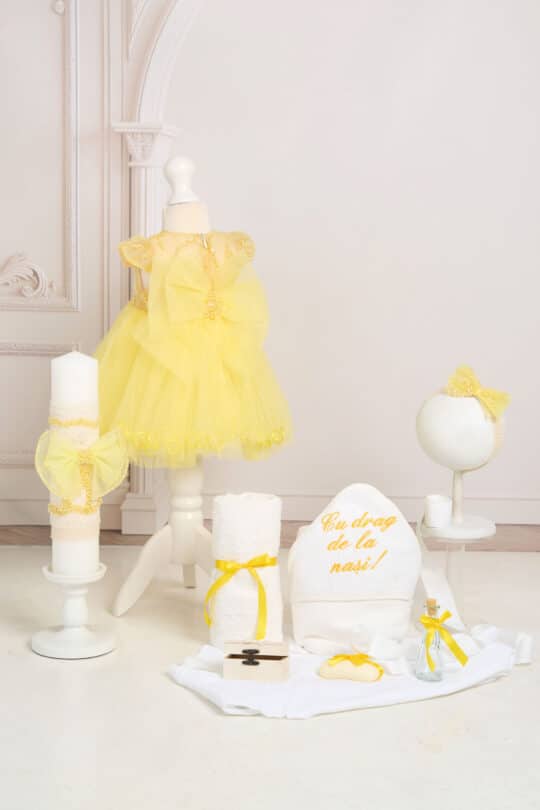 🕯️ Lumânare de botez –Lumânarea de botez are ca element central o fundă voluminoasă din tulle galben, conturată cu paiete aurii și accesorizată cu perle, simbolizând puritatea și bucuria botezului.
