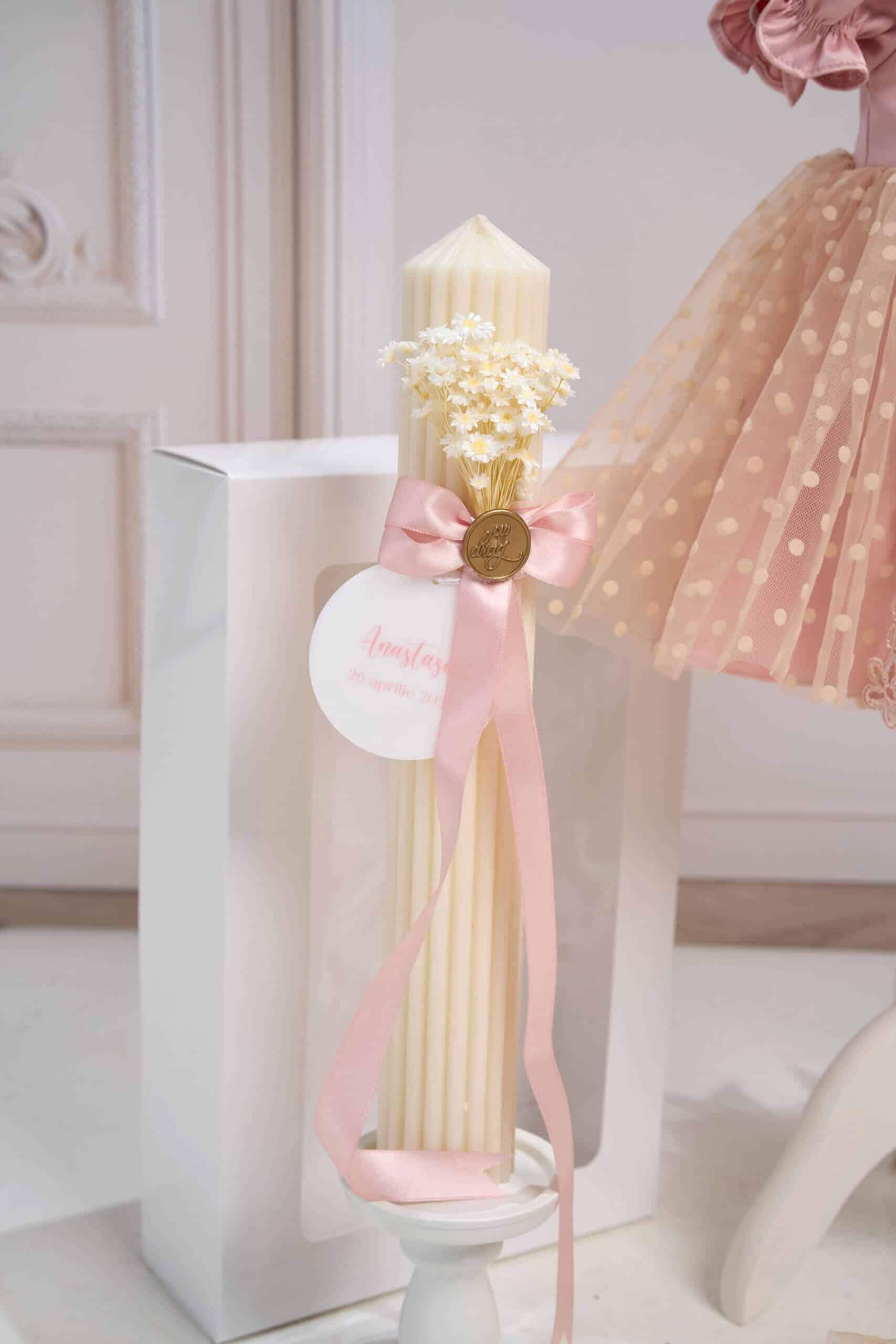 🕯️ Lumânare de botez – Lumânarea de botez este decorată cu floricele uscate, fundă din satin roz pudrat și sigiliu elegant auriu, pentru un stil delicat, modern și natural.