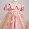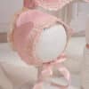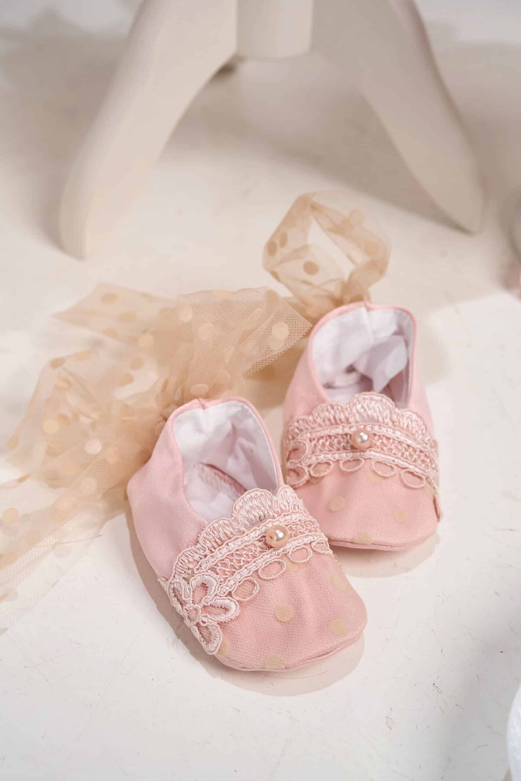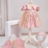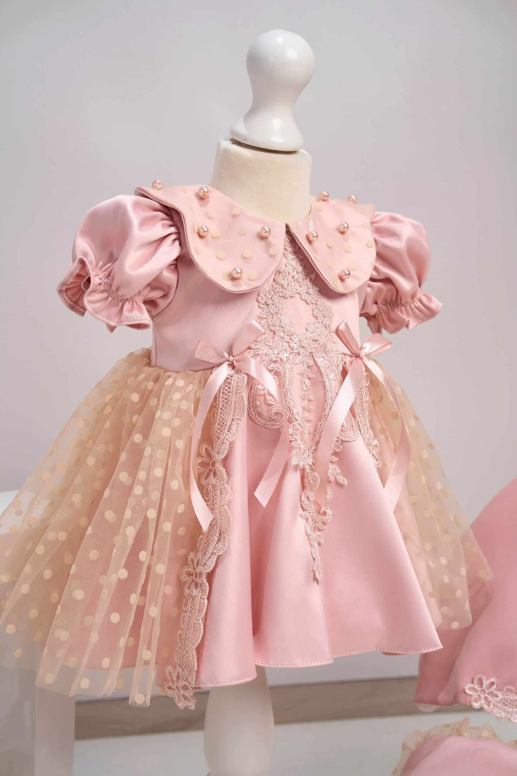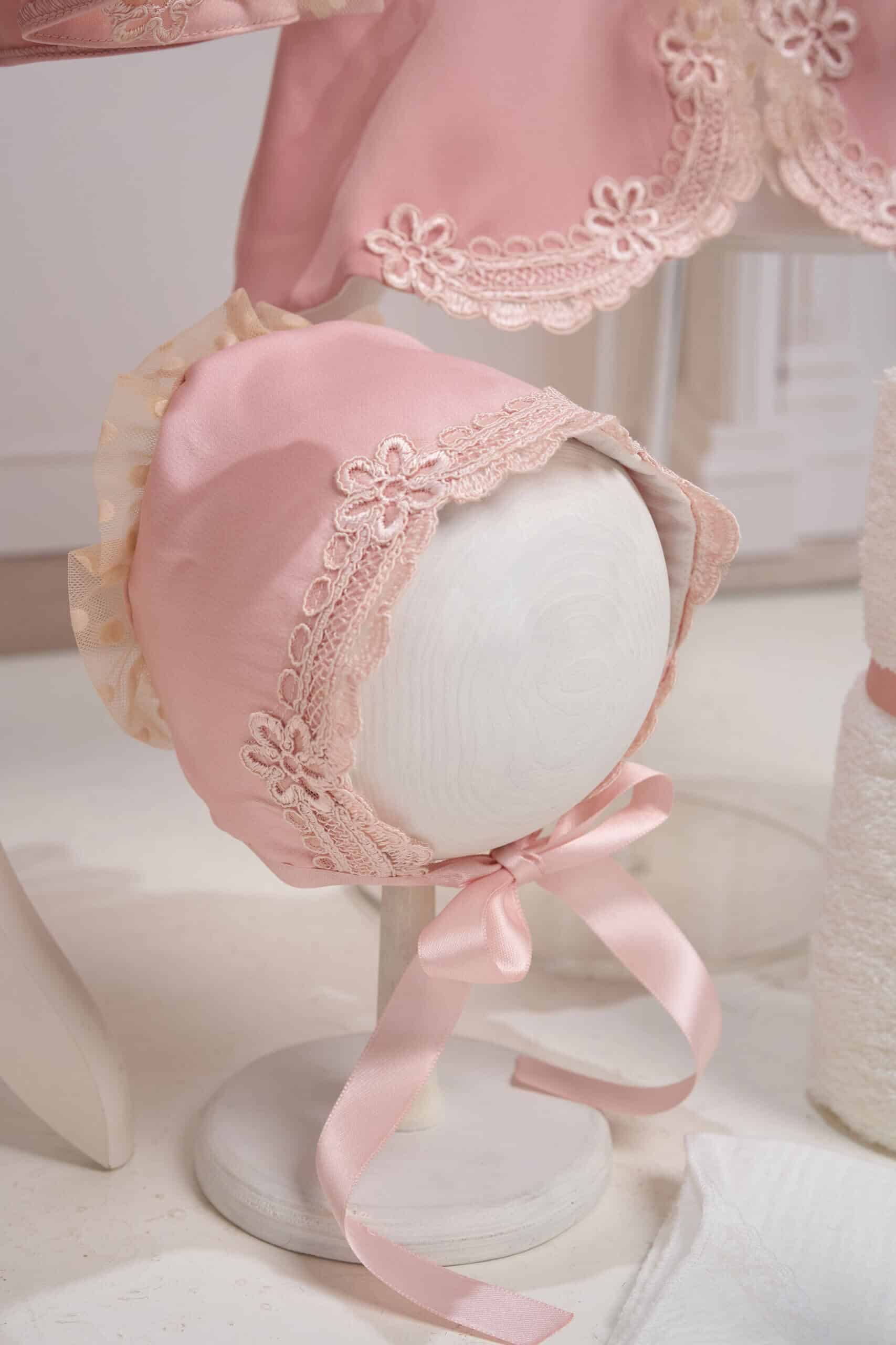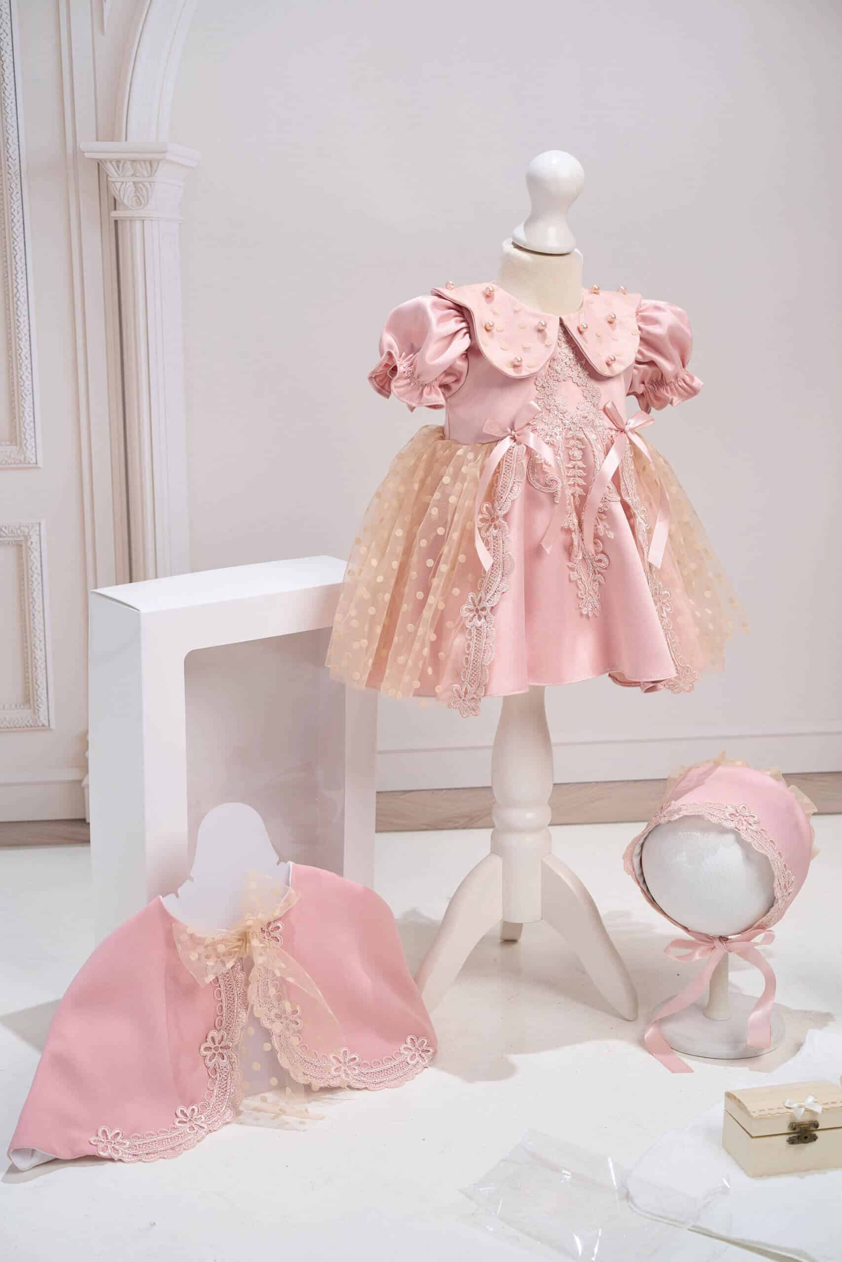 🎀 Setul de îmbrăcat pentru fetițe „Audrey” – 4 piese – este compus dintr-o rochiță roz din satin fin cu aplicații de dantelă brodată și tulle cu buline, capă asortată, bonetă delicată și botoșei decorați manual – o alegere rafinată pentru un botez de poveste.