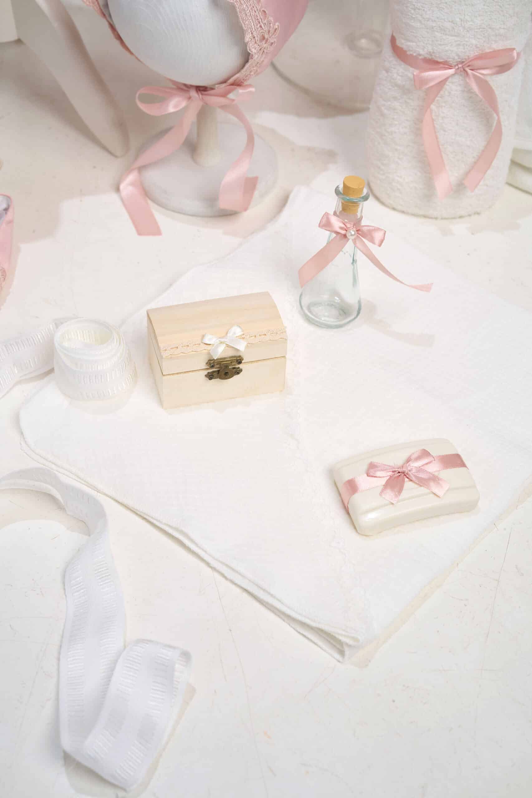 🕊️ Trusou de botez 7 piese – Tot ce ai nevoie într-un singur loc! Prosop cu capișon bebeluș, prosop preot, pânză cu capișon de mir, fașă, săpun, sticluță mir decorată și cutiuță pentru prima șuviță.