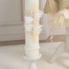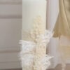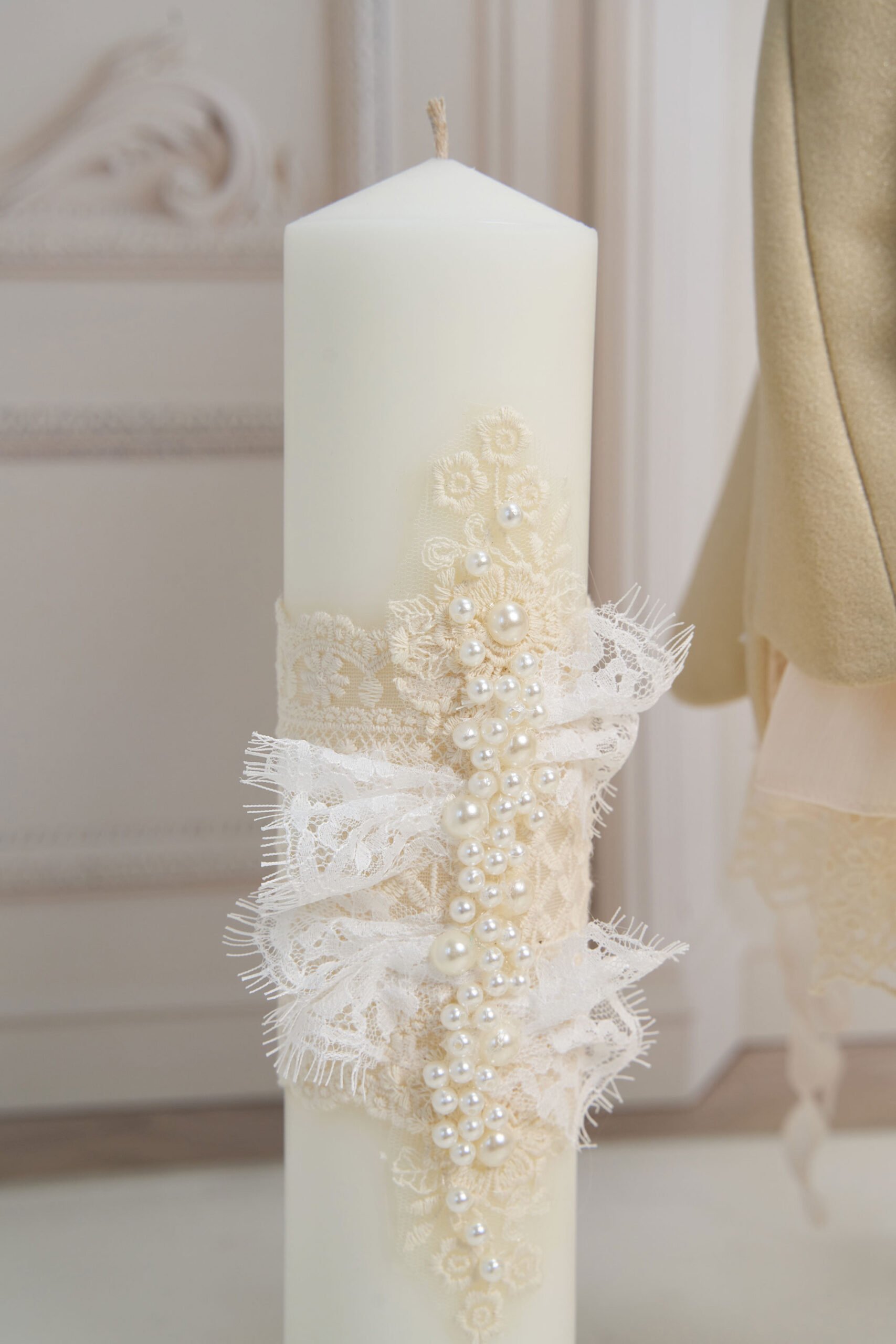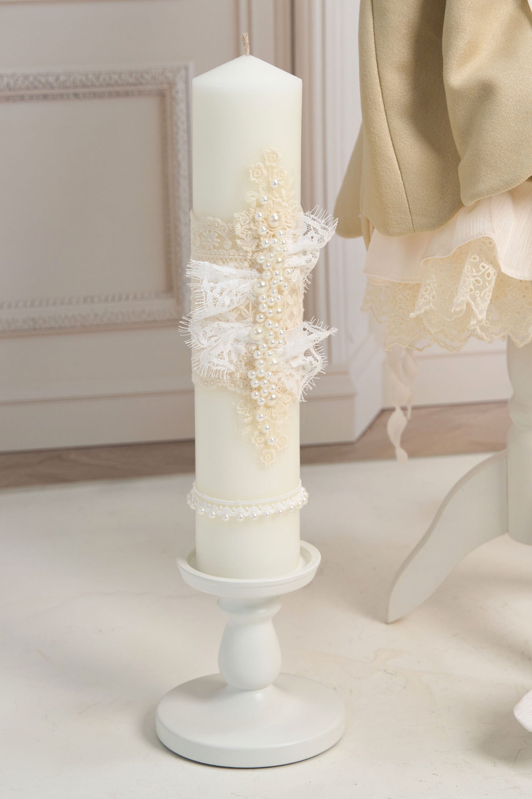 Lumânare de botez Chantilly – decorată cu dantelă fină și fundă elegantă cu perle, creată cu atenție pentru o ceremonie de neuitat.
