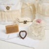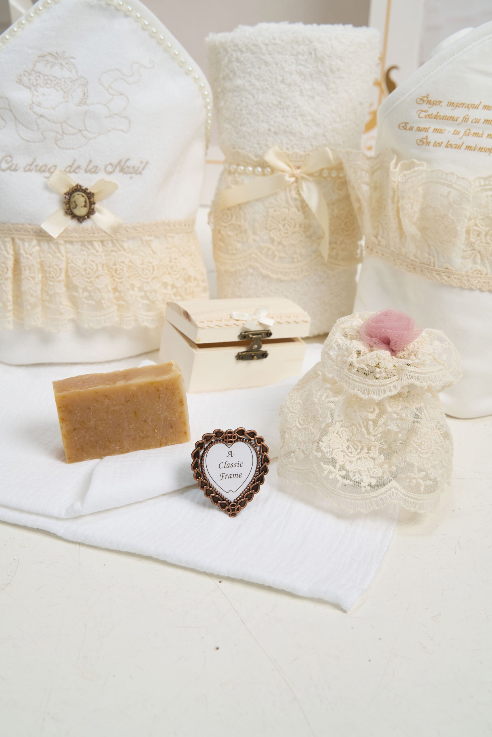 Trusou botez complet (9 piese) – conține tot ce este necesar pentru ritualul de botez: prosop cu capișon pentru bebeluș, scutec din bumbac, prosop pentru preot, pânză de mir, fașă, săpun, sticluță de mir decorată, cutiuță pentru prima șuviță și mini ramă “mărturie” pentru fotografie sau iconiță.