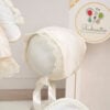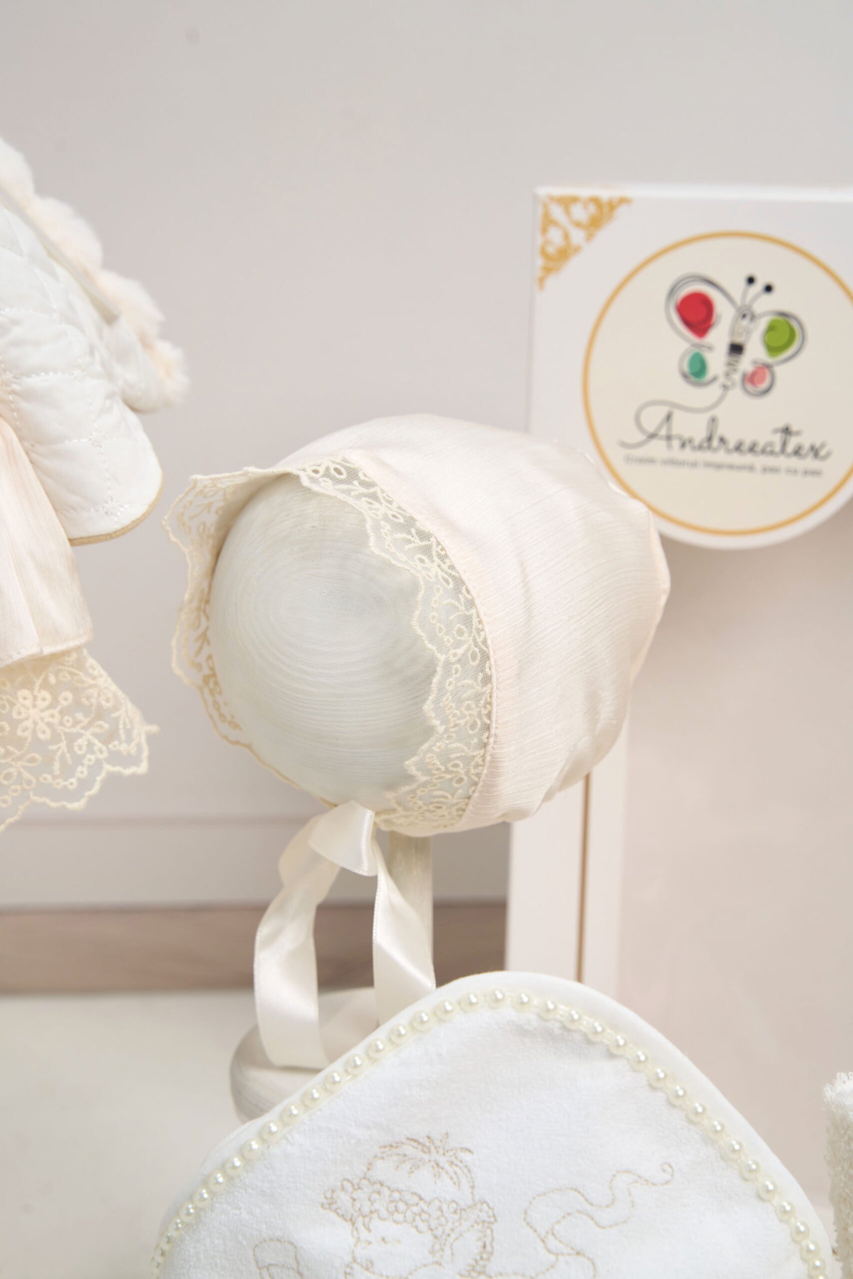 Rochiță de botez Borangic – dintr-un material fin, cu textură ușor creponată și nuanță caldă de ivoire, acest set de botez include 3 piese: rochiță, bonetă și botoșei – perfect asortate pentru un look boem.