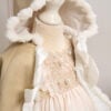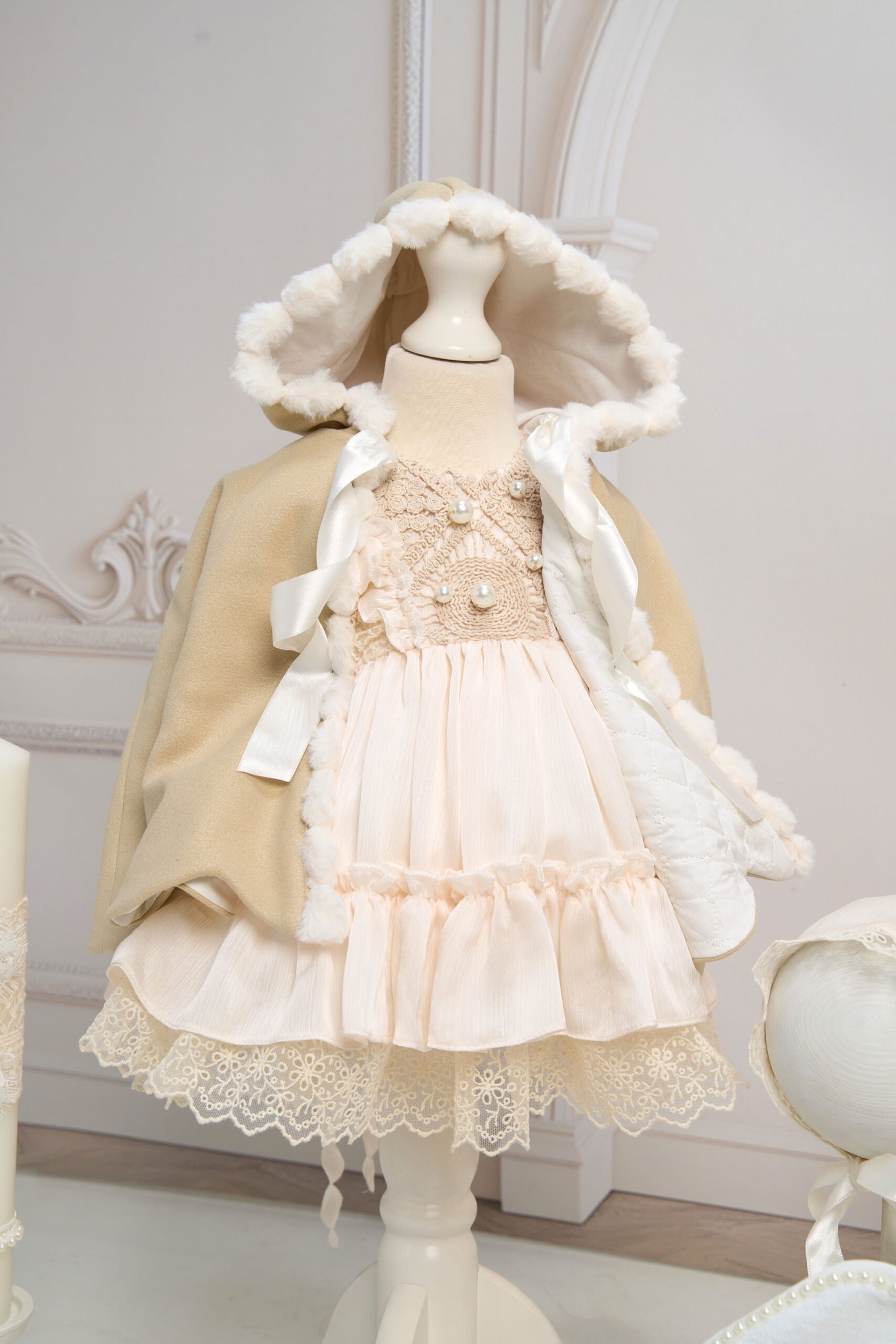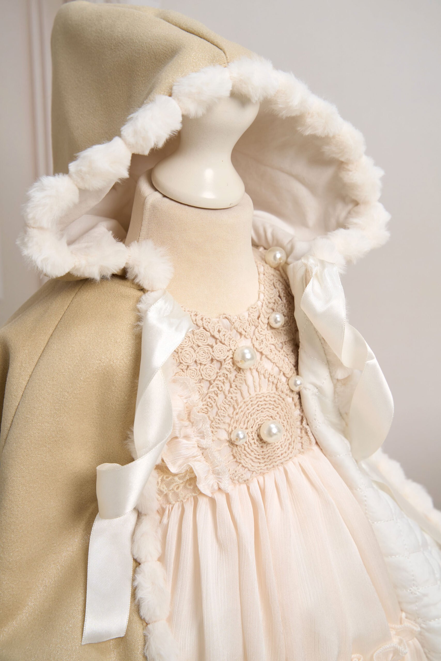 Capă Floare bej – capă ca o floare gingașă, confecționată dintr-o stofă moale și delicată, iar pe margine cu accent de blăniță, care adaugă o notă de căldură și eleganță. , ideal pentru sezonul rece.