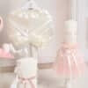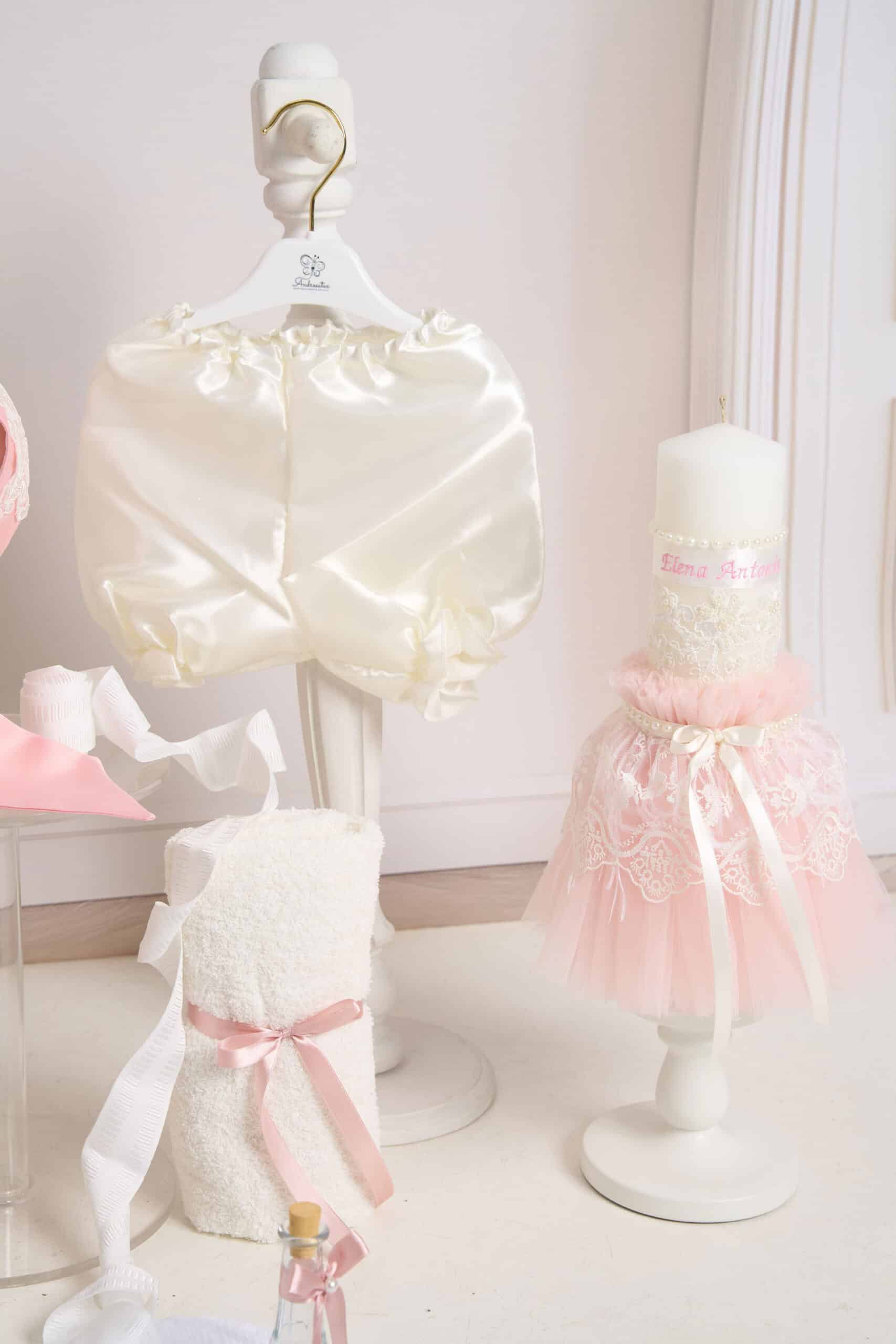 🕯️ Lumânare de botez – Creată în nuanțe delicate de roz și ivoire, are fustiță de tull, pene, dantelă 3D pe lumânare și o fundiță de satin ce completează ținuta.