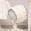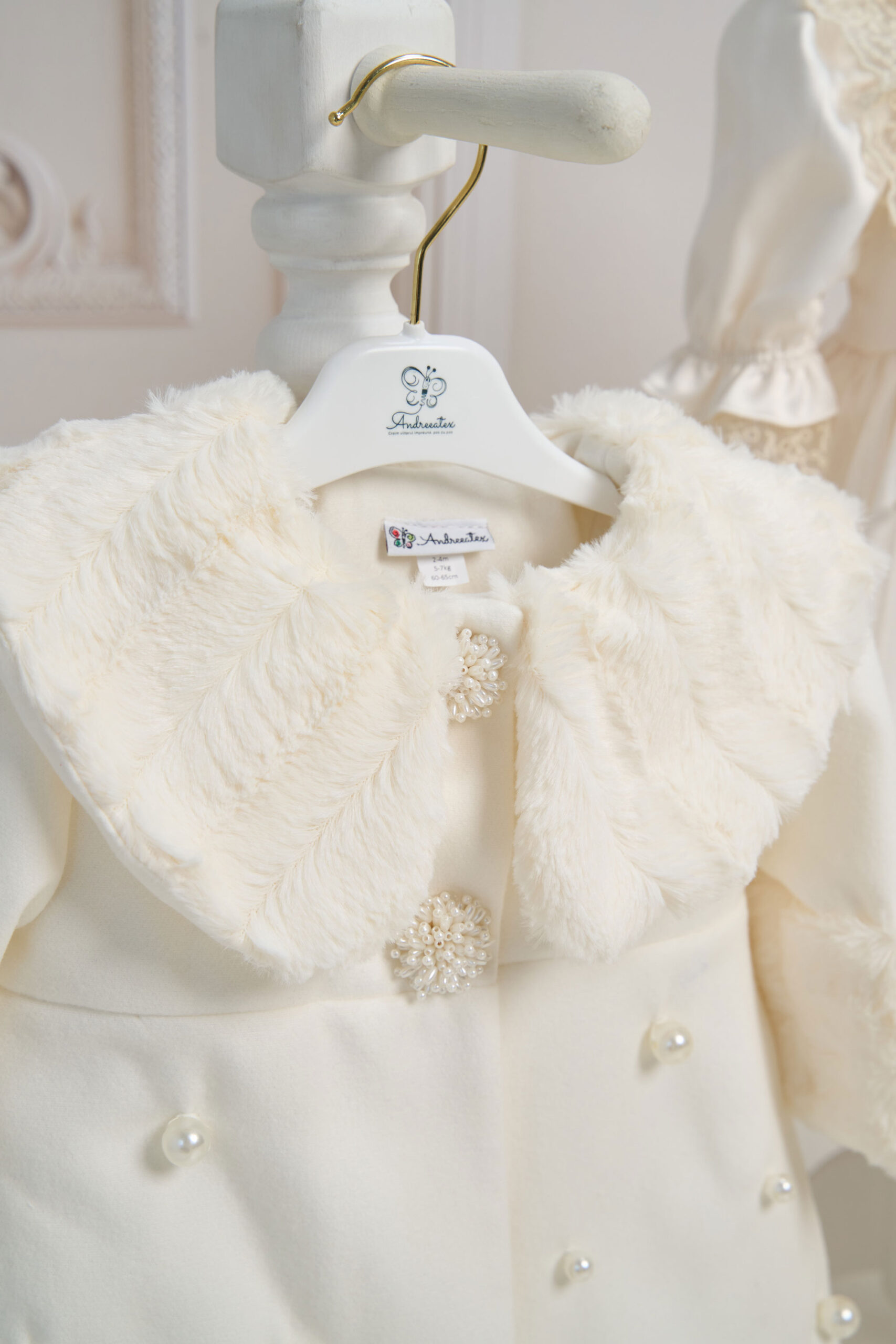 Palton Anne ivoire – palton elegant din stofă moale, cu guler din blăniță și bonetă asortată. Decorat manual cu perle fine, oferă un plus de rafinament , ideal pentru sezonul rece.