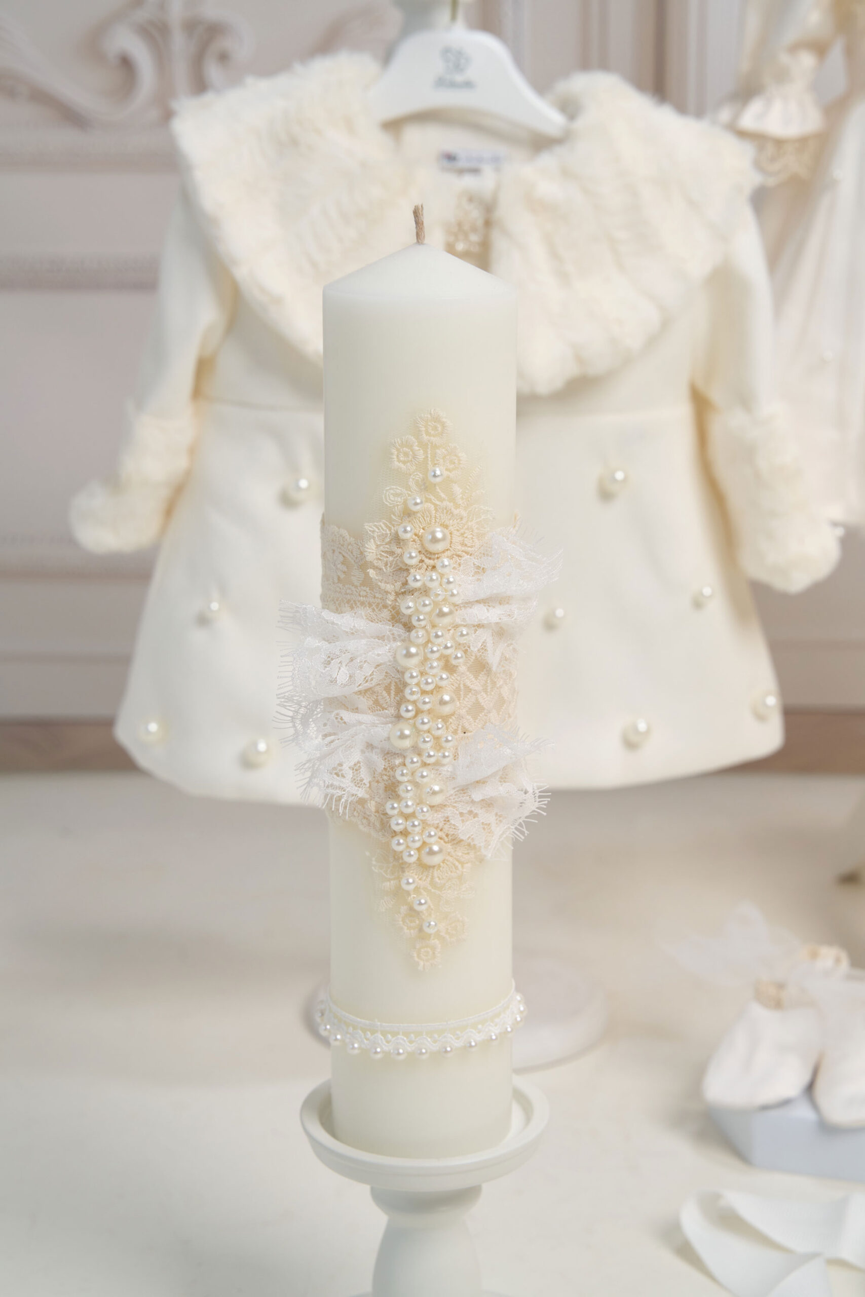 Set botez Celeste și palton Anne + Trusou + Lumânare – ivoire