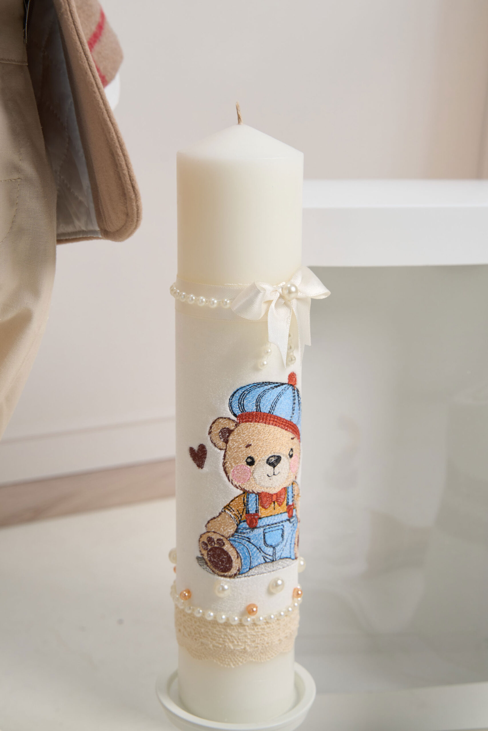 🕯️ Lumânare decor – realizată într-o nuanță delicată de albastru, decorată manual cu un ursuleț brodat.