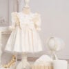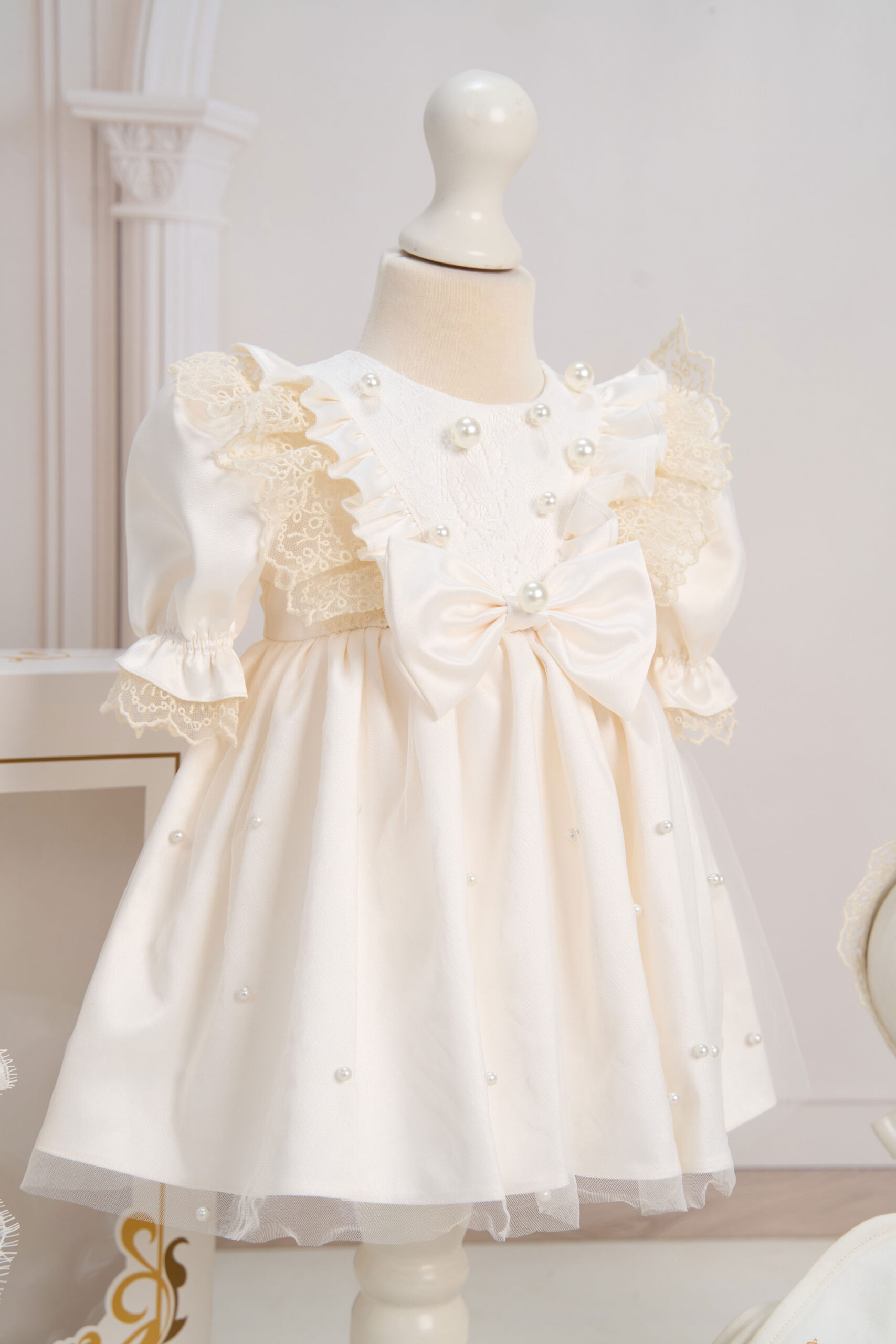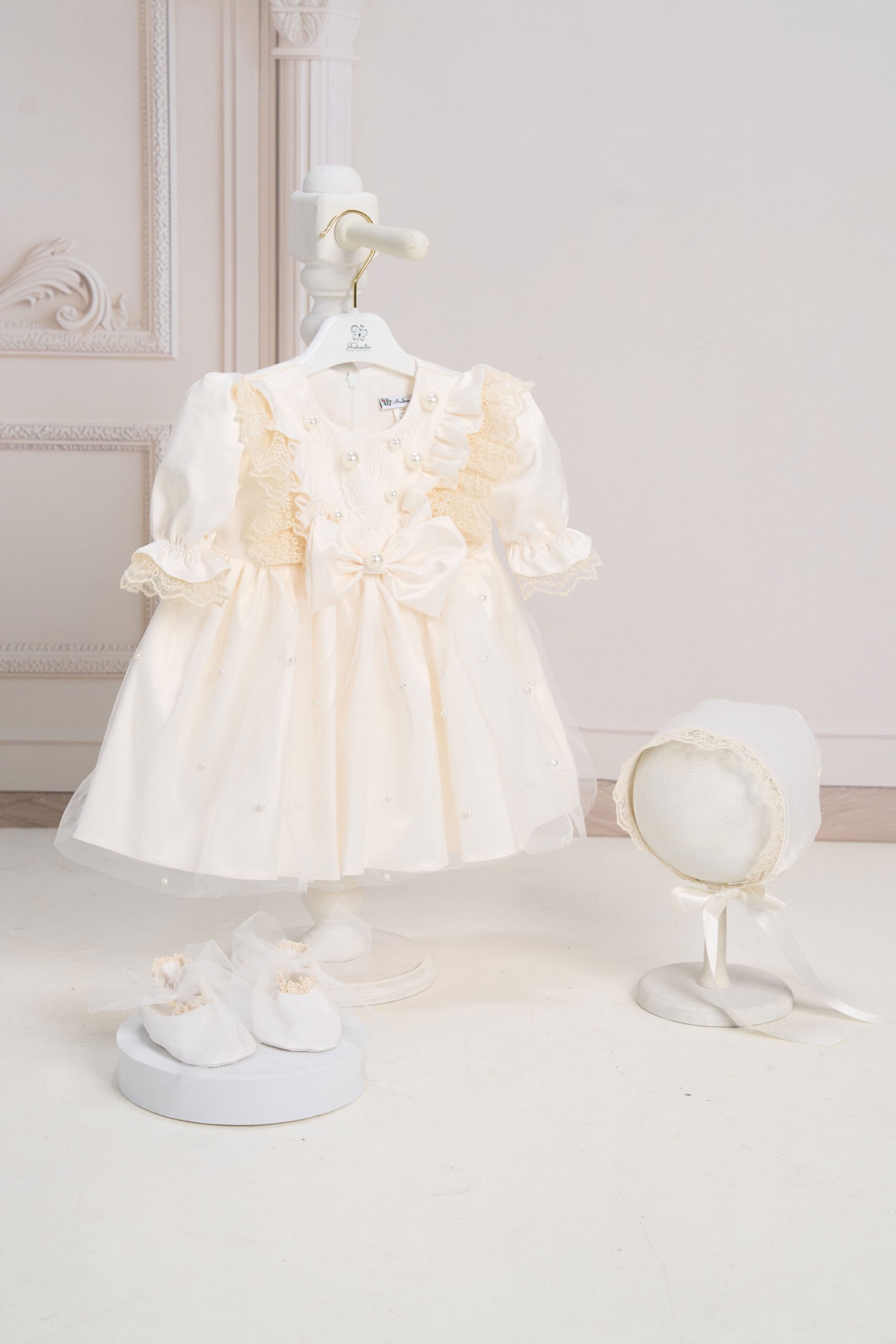 🎀 Set 3 piese – Rochie de botez fetiță Celeste cu dantelă, perle și fustă din tul – elegantă și delicată.