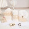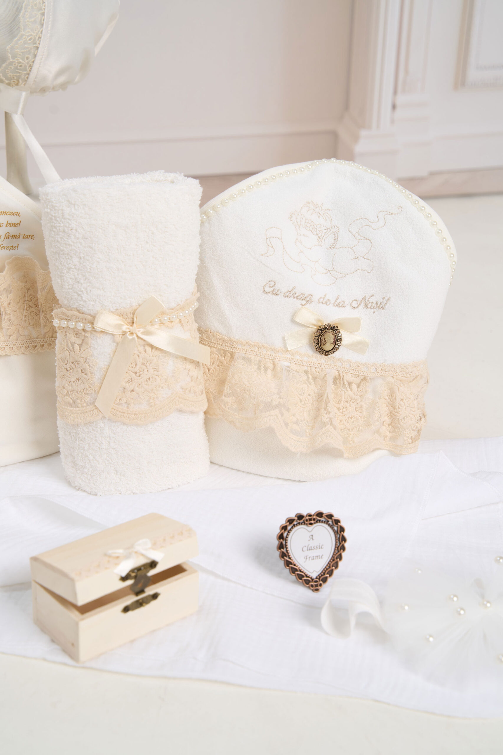 🕊️ Trusou de botez 9 piese – Tot ce ai nevoie într-un singur loc! Prosop cu capișon bebeluș, scutec bumbac cu capișon bebeluș, prosop preot, pânză de mir, fașă, săpun, sticluță mir decorată, cutiuță pentru prima șuviță și mini ramă “mărturie” – pentru poză bebeluș sau iconiță