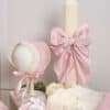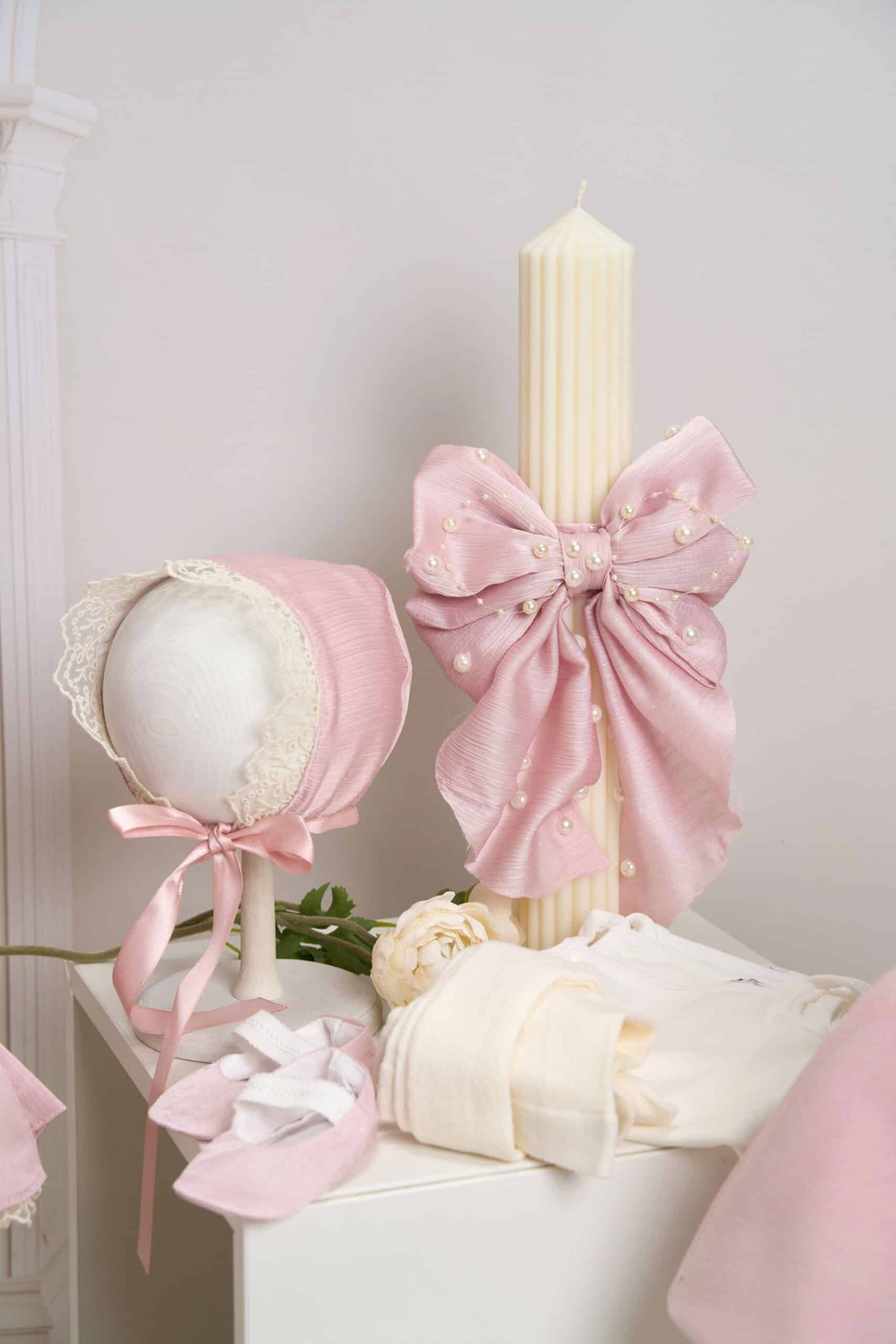 - Lumânare botez – A33 cu fundă elegantă și perle – roz