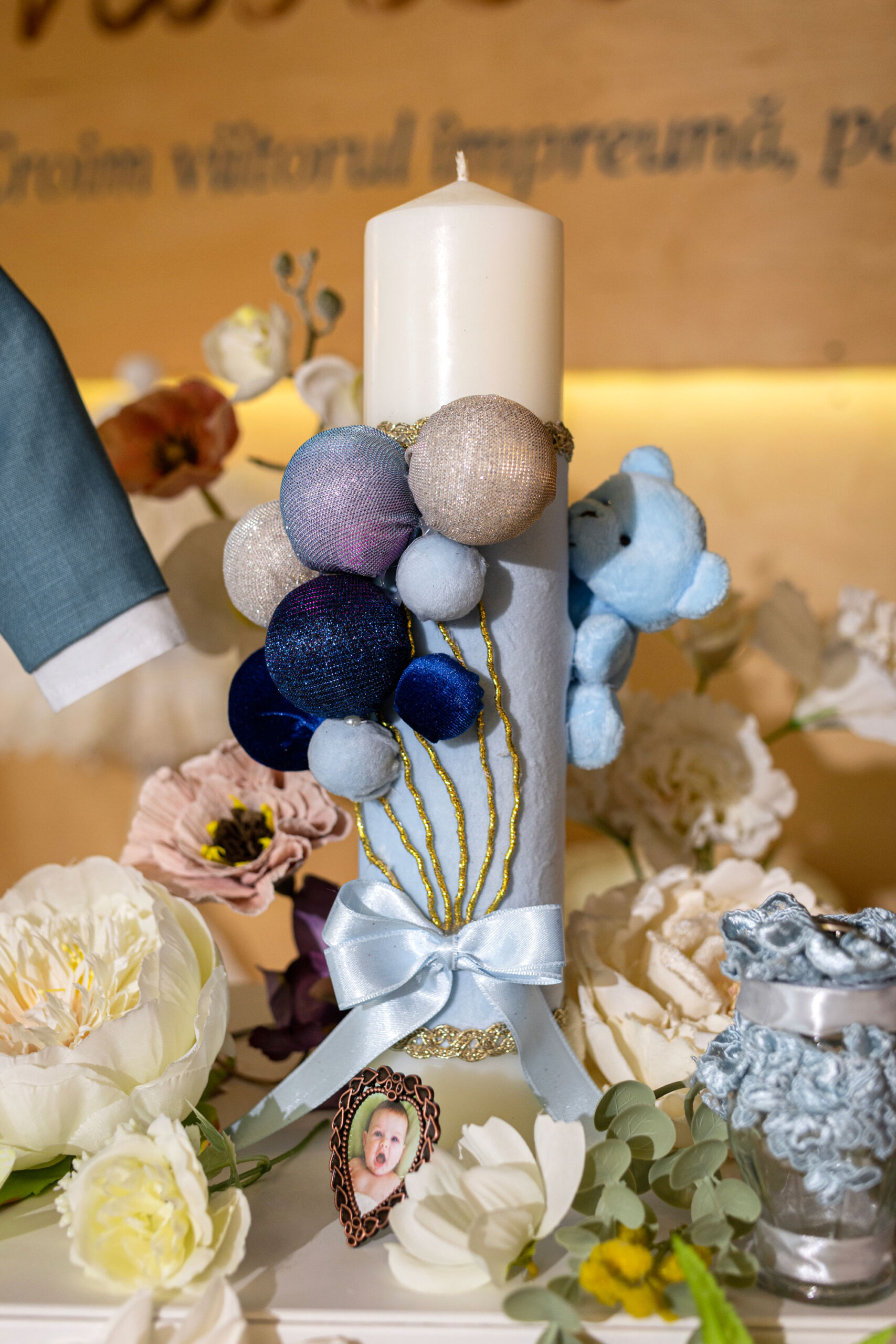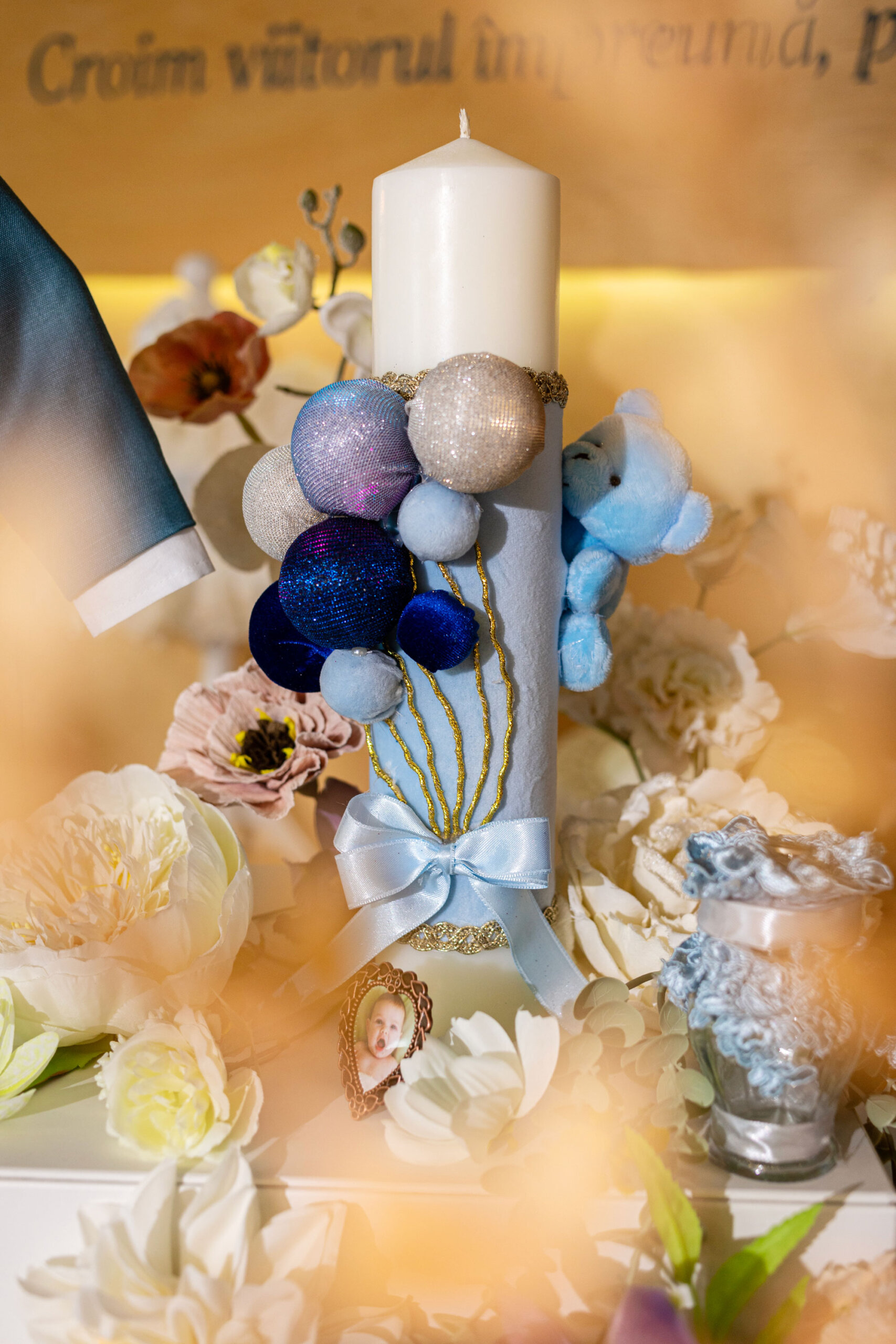 - Lumânare botez – L21 – Ursuleț cu baloane pe catifea albastru