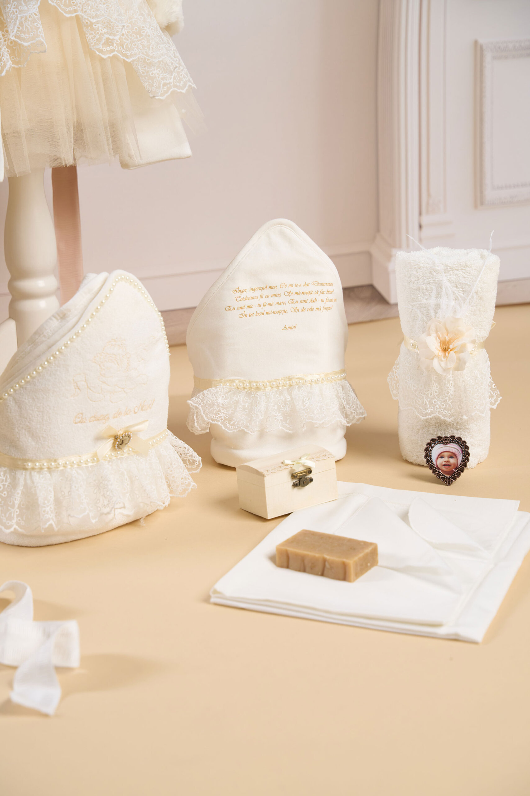 🕊️ Trusou de botez 9 piese – Tot ce ai nevoie într-un singur loc! Prosop cu capișon bebeluș, scutec bumbac cu capișon bebeluș, prosop preot, pânză de mir, fașă, săpun, sticluță mir decorată, cutiuță pentru prima șuviță și mini ramă “mărturie” – pentru poză bebeluș sau iconiță