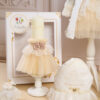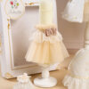 🕯️ Lumânare de botez – Lumânare asortată rochiței din tull de nuanța șampanie, dantelă cu floricele mici și trandafiri creați manual, cu accente de perle pe stâlp.