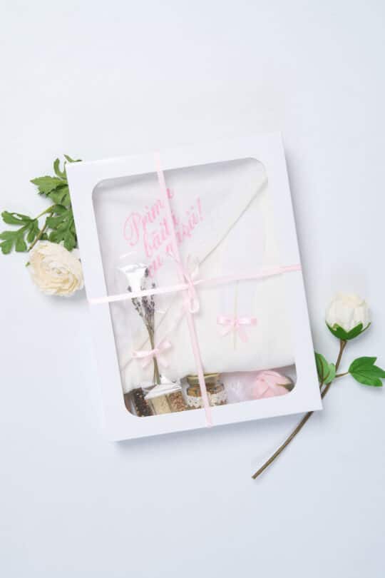Setul vine într-o cutie rafinată, cu capac transparent, decorată cu o panglică fină și panglică roz de satin, ideală pentru a fi oferită în dar cu ocazia primei băițe.